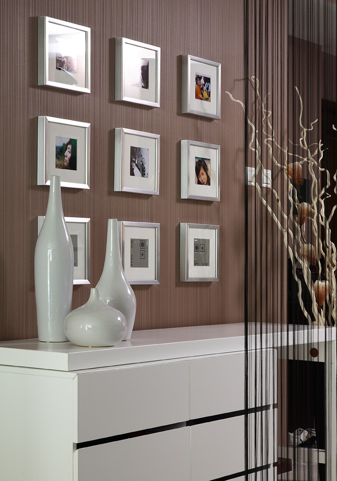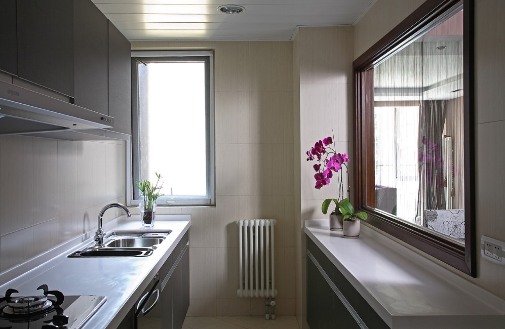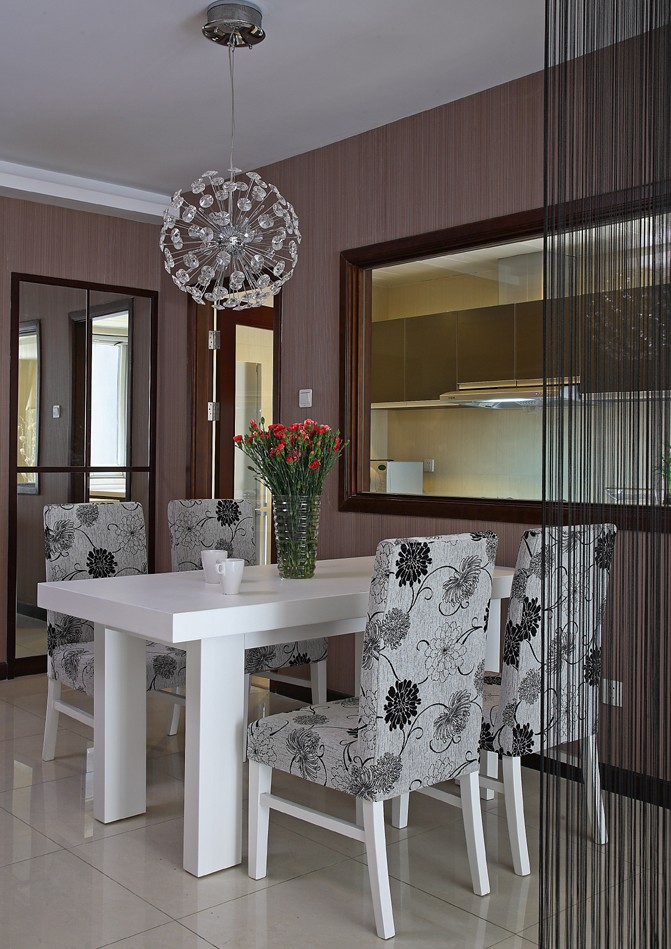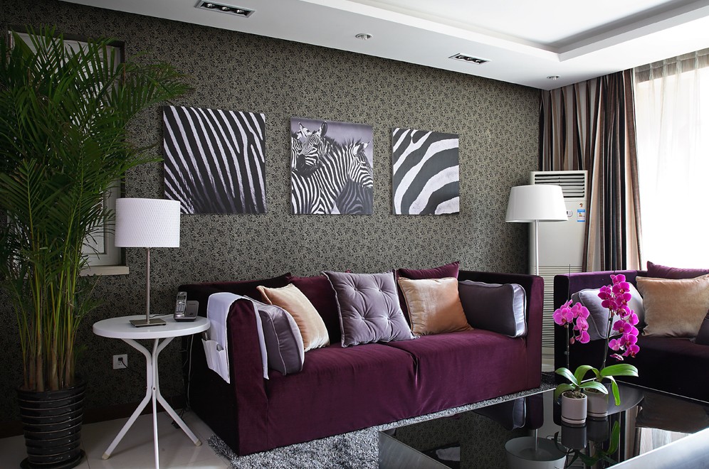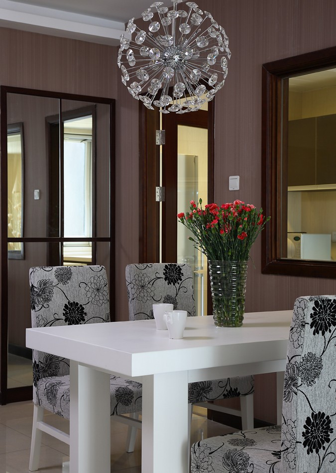 设计亮点:户型的缺点为进门正对的一面墙离入户门太近且是卫生间,所以显的很压抑,户型的整个中心部分是卫生间,为了保留两个卫生间的正常使用,而且能够让门厅区域不显的那么压抑,所以卫生间的轻体墙部分,全部拆除,重新改动格局,包括厨房开成开放式,入户正对的一面照片墙设计,采用乳白色边框,用黑色点缀,再配上同色的门厅柜,再加上从门厅通往客厅区域利用过梁来制作大气的木制品包哑口,这样一来立马改变心情,改变空间紧凑感。从空间简约及温馨角度出发,色彩方面没有用过于艳的颜色,以体现女主人高贵优雅生活品质为前题,家俱采用了乳白色黑色点缀,和深紫色布艺沙发搭配各色抱枕做为主色调。淡色用的太多,怕空间太轻快,所以必须要用一种颜色来压住这些淡色,因而沙发背景墙用深色壁纸来铺贴,使整个空间简约而不失优雅。卧室主要是淡粉色为主,如果用粉色乳胶漆,可能过于普通,那么在选择壁纸方面就要注意,因为布艺可以用粉色,如果墙面再使用过粉的颜色,怕没有闯色,会不太突出空间感觉,所以休闲沙发选择单人乳白色沙发,床上用品选择藕荷色布艺,藕荷色是女主人比较倾向的颜色,那么也是相当温馨的色彩,然后墙面再用大花的壁纸,这个整个空间立体感觉立马突显出来。