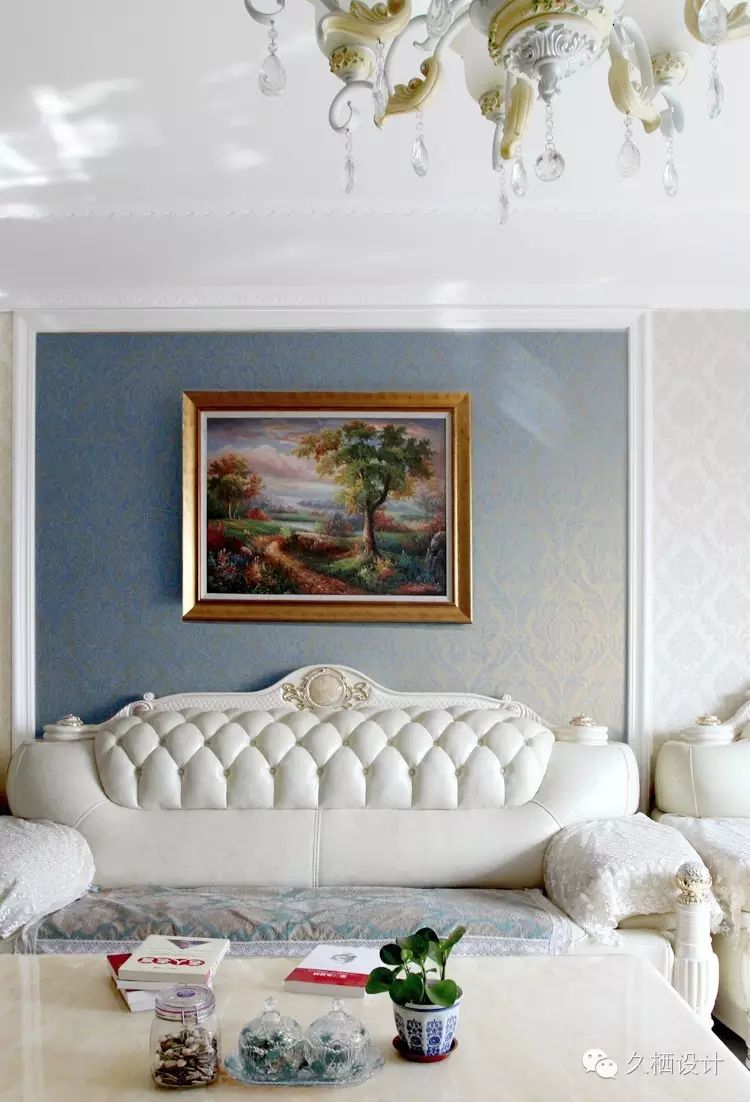 对称的沙发墙面装饰,结合了现在国人对方正感的追求正中间的独立油画,笼络视野,恰到好处