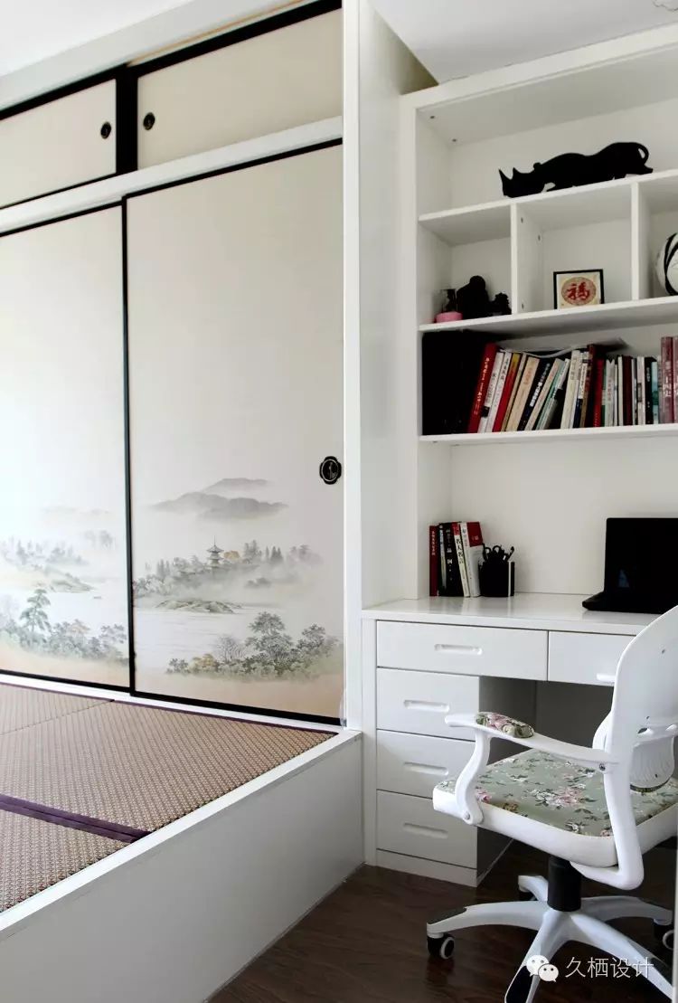 书房空间的地台设计满足了主人的储物需求量,中式的衣柜与白亮色系家居搭配并不冲突从另一个功能区漫步到此,过渡自然,和谐装饰效果