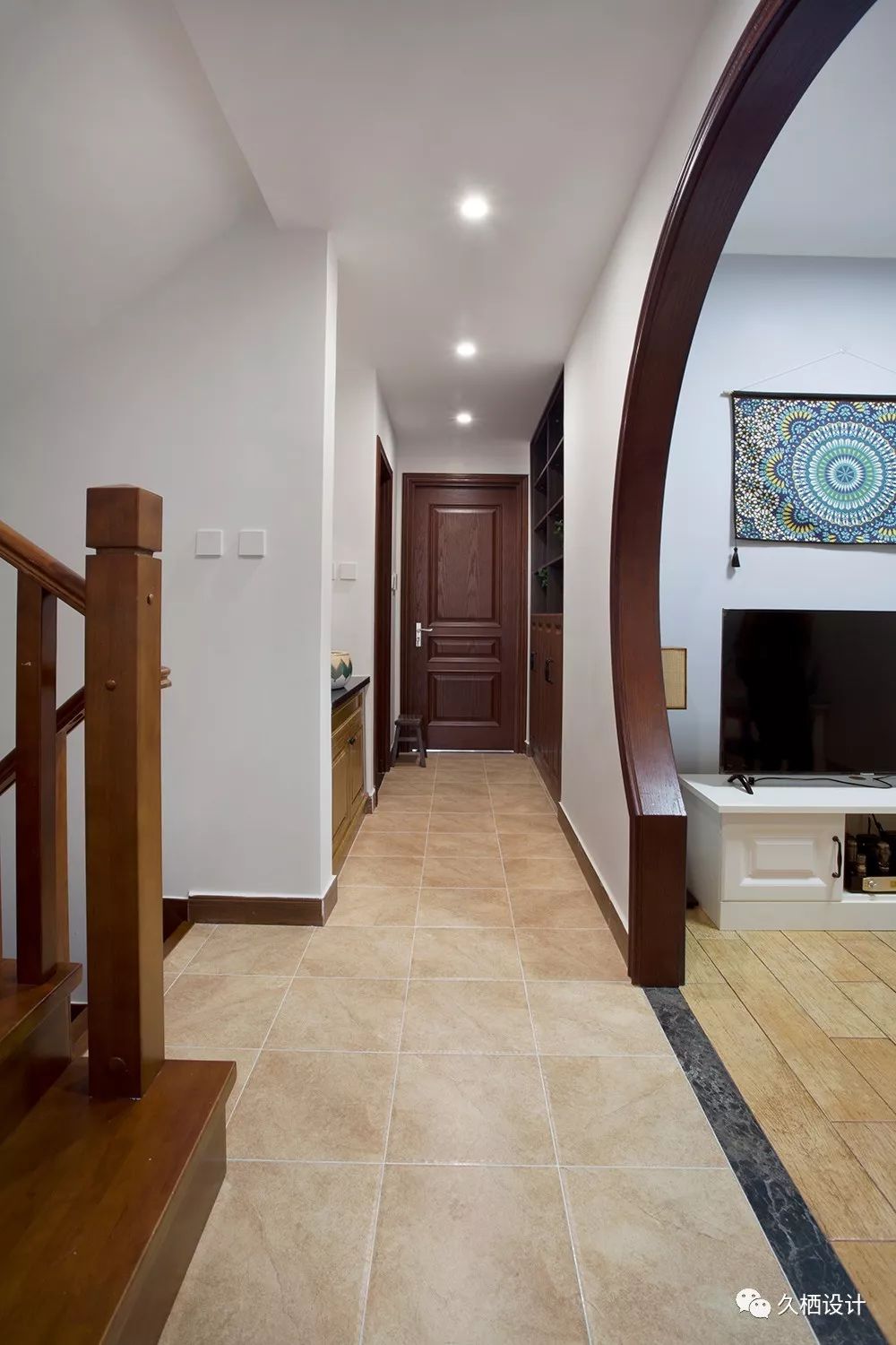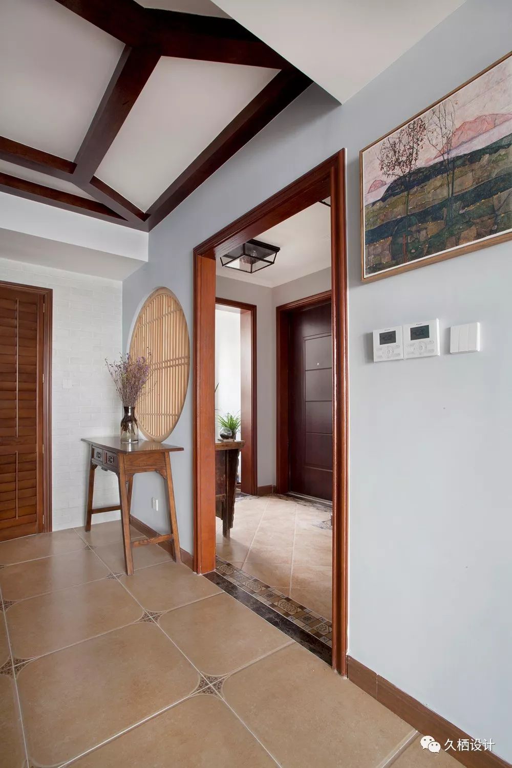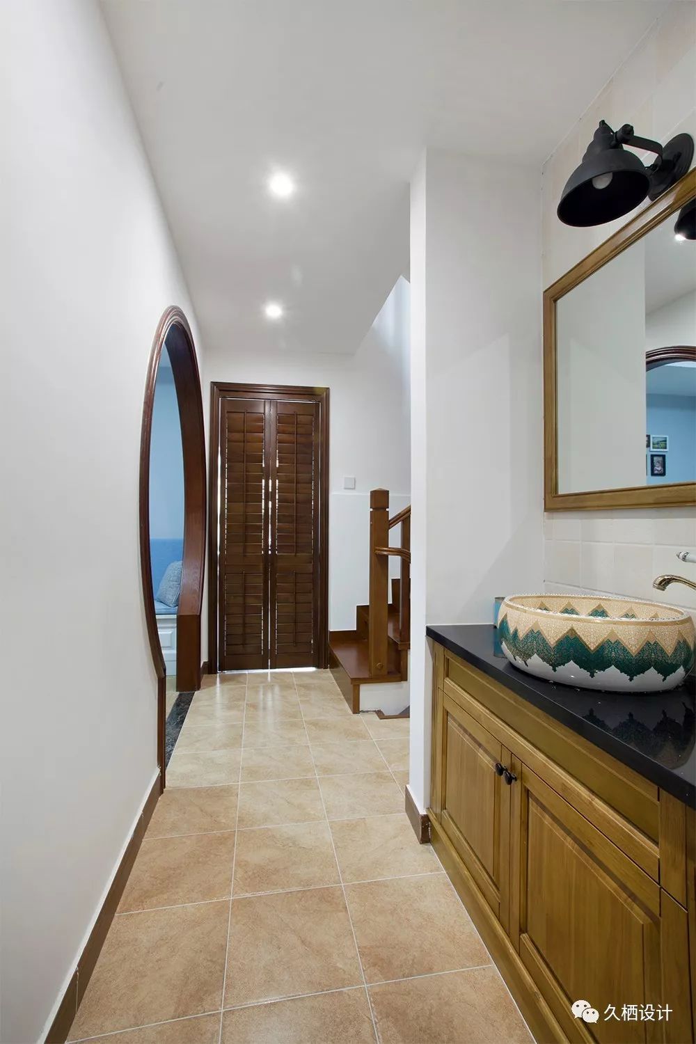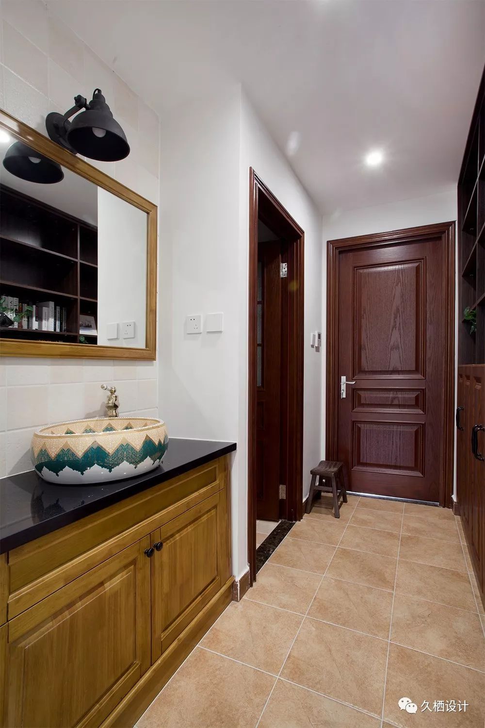 走廊过道放置了一个客卫用的干湿分区洗手柜,古色古香的陶瓷台上盆,蛮有意境的独立的木色是特意挑选出来的,多种深浅程度的对比,能避免过道部分的狭隘感