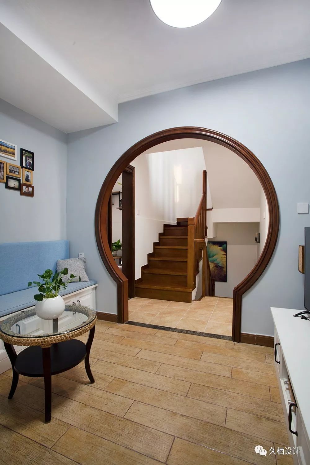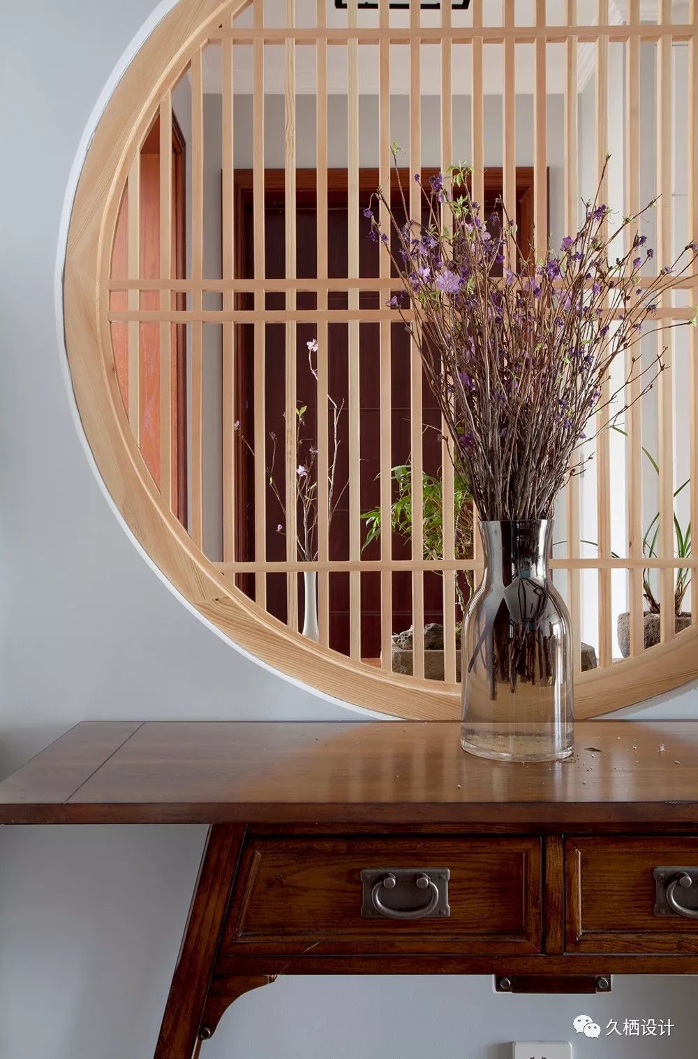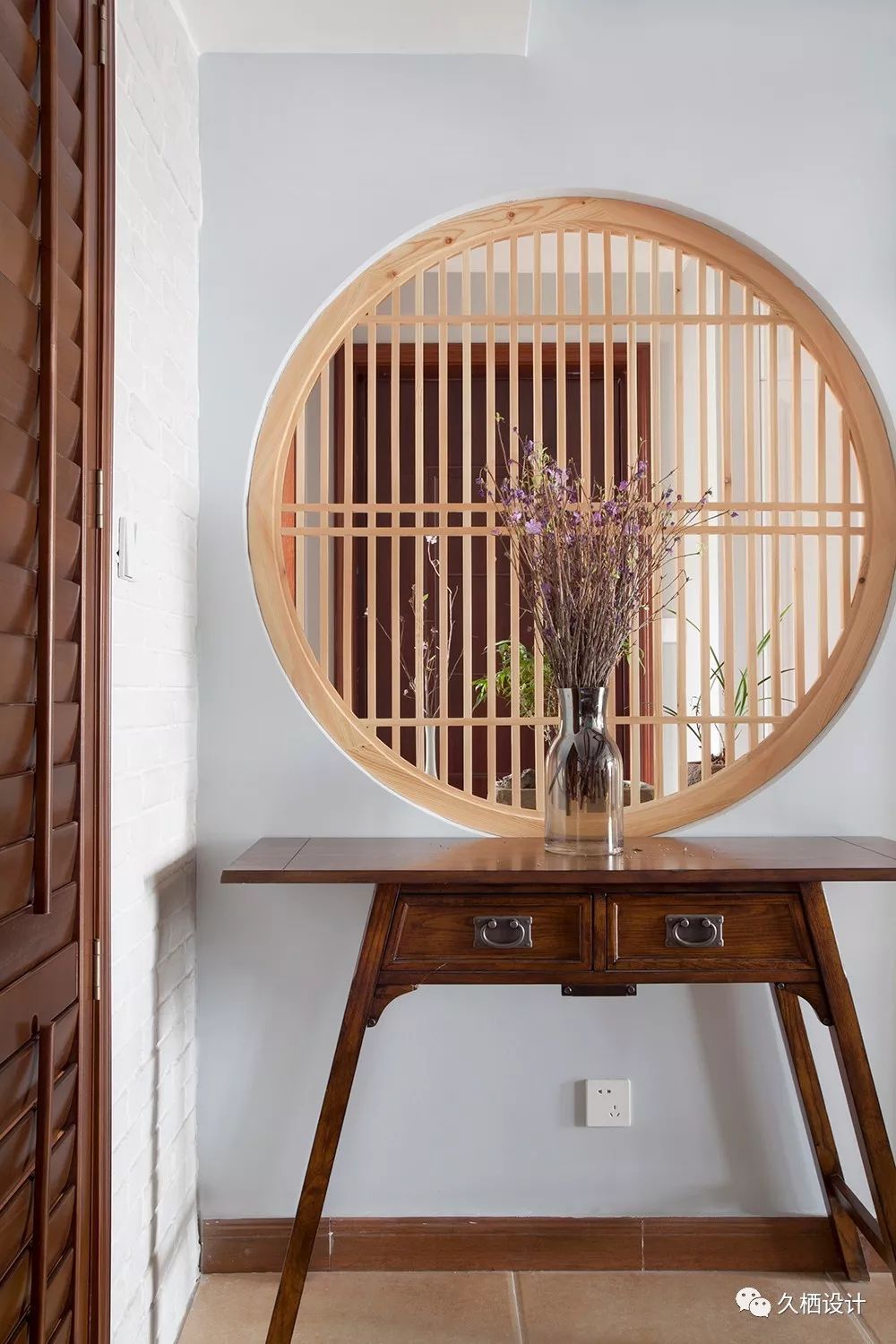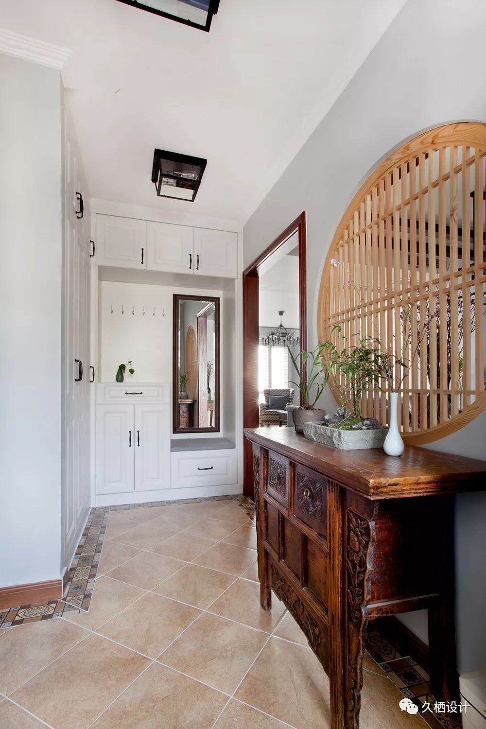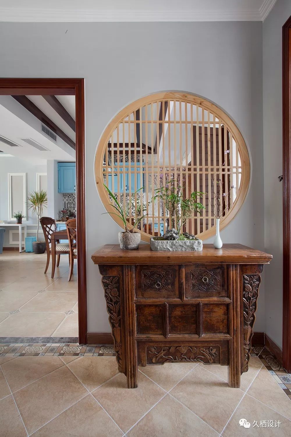 家里有来客,站在门口的时候就一眼看全室内的情况是很多人会比较忌讳的圆形的小格栅窗效果还不错,既有遮挡性,还不显得那么闭塞靠在窗下的玄关柜,是屋主海淘来的南亚风格产物,尺寸刚好