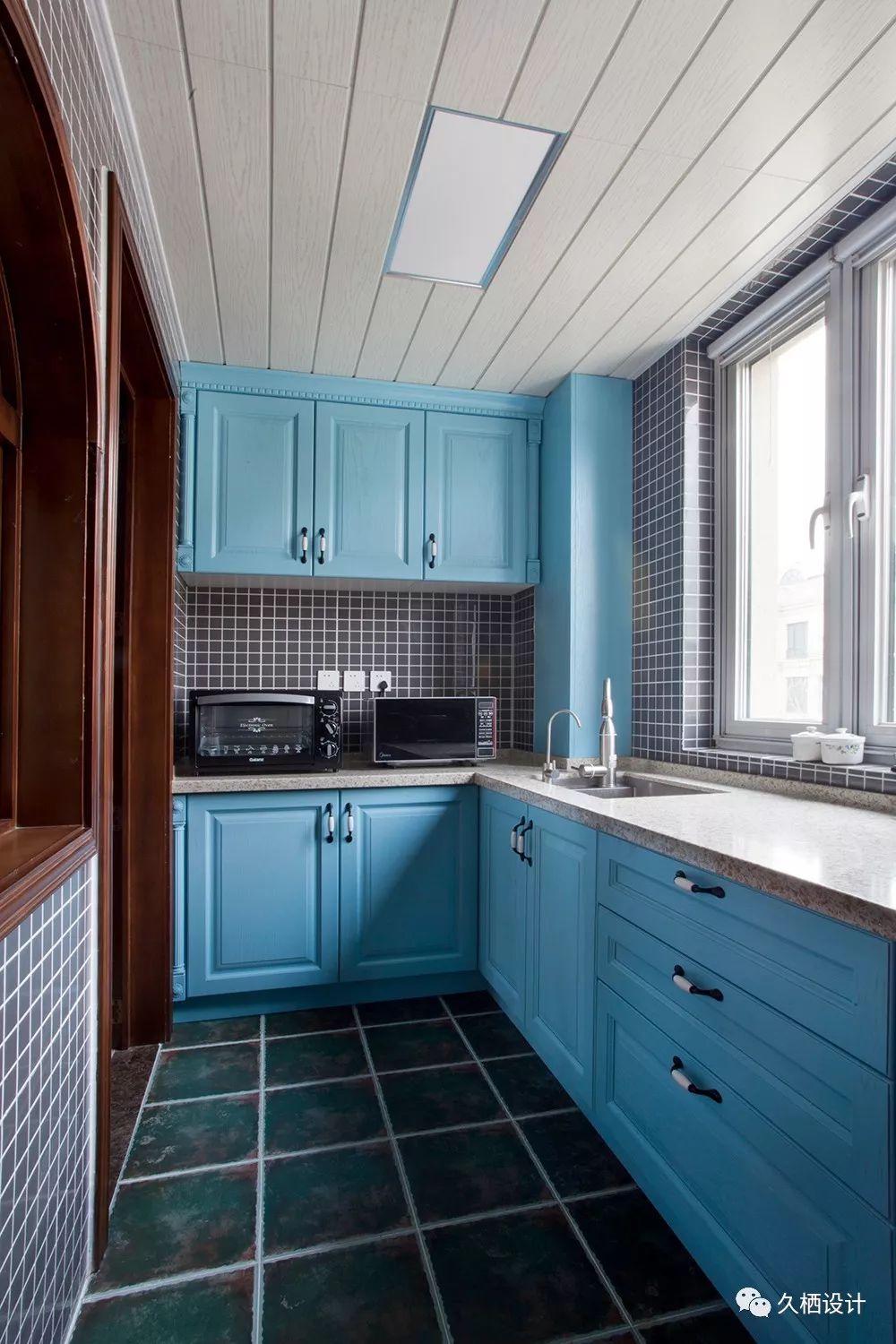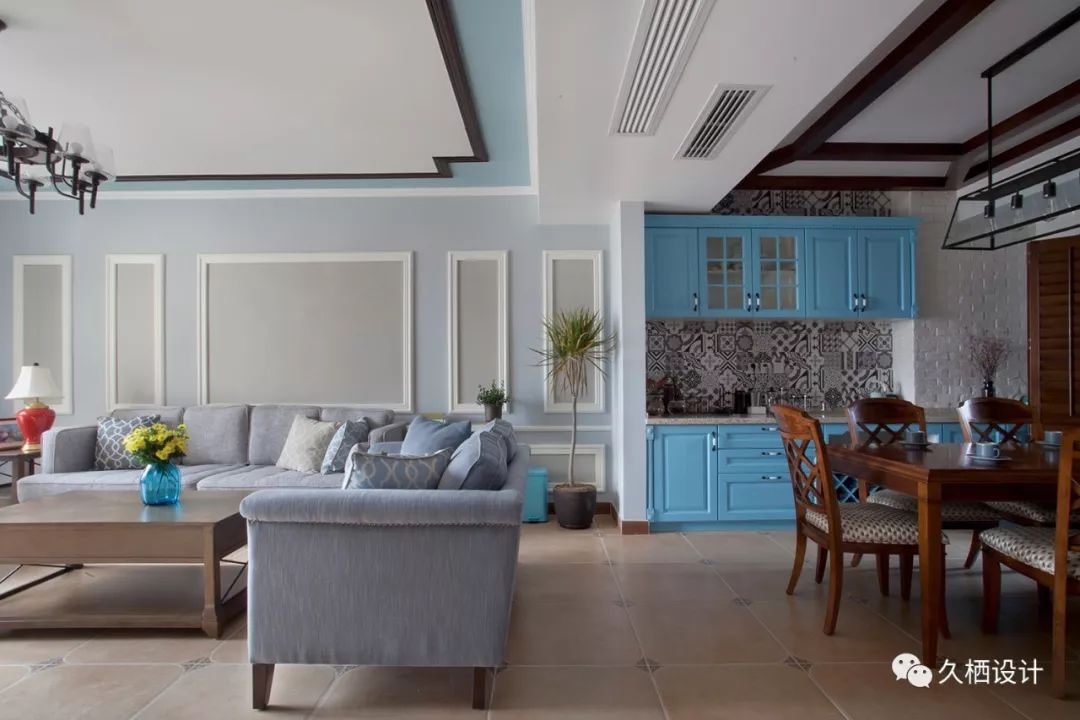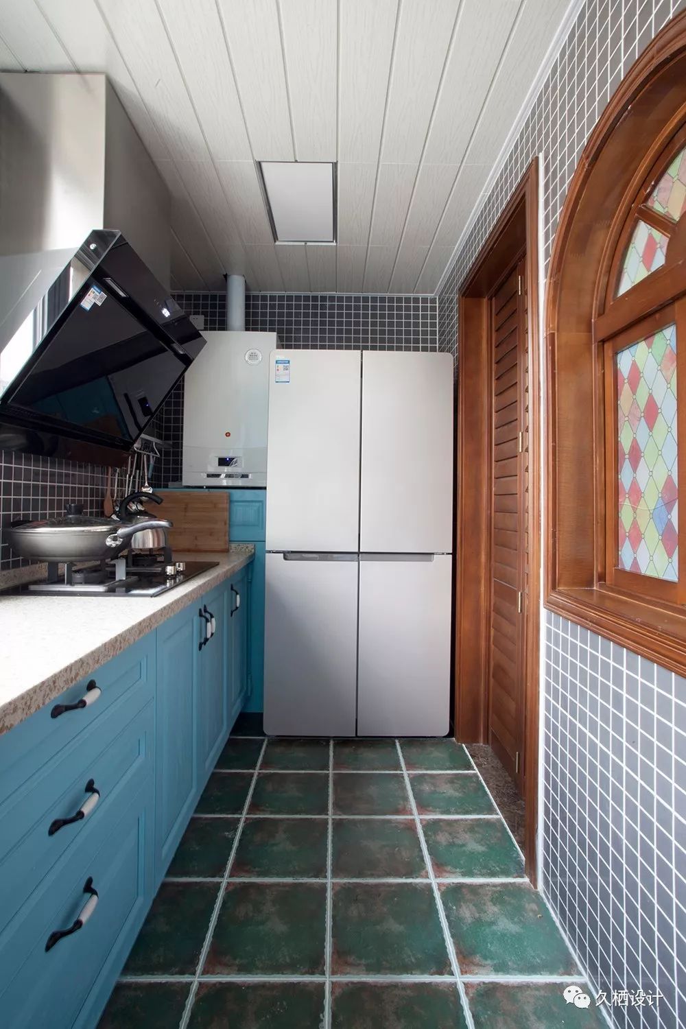 中厨区域被完全隔离到里面,延展出5米多长的橱柜,让忙碌的光荣劳动者,在里面能完全耍得开浅蓝的柜板延续西厨用色一脉相承,搭配地面的墨绿色仿古砖,感觉还满惬意