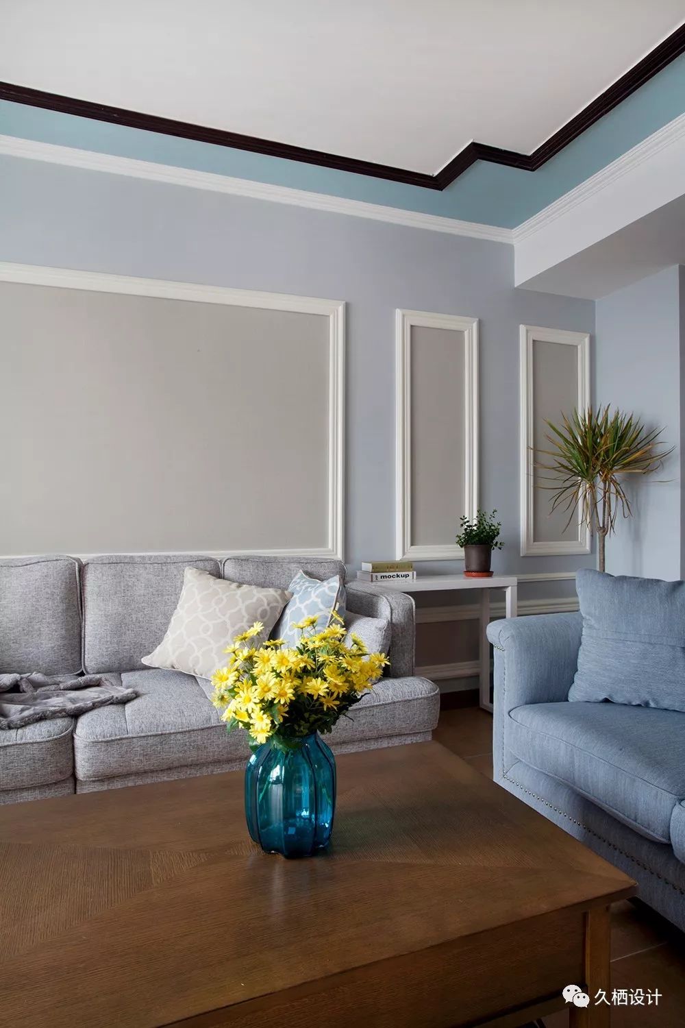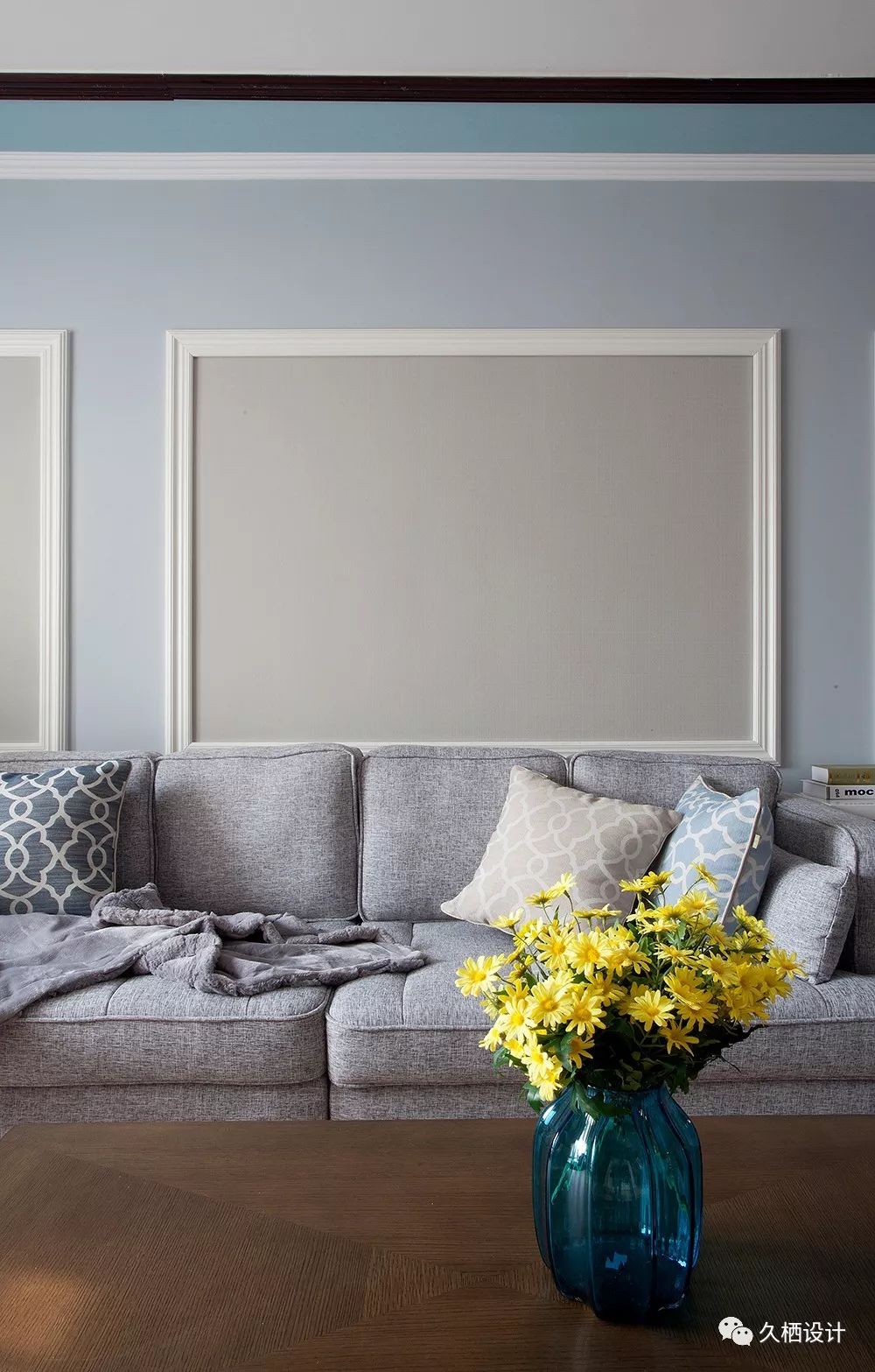 喜欢背景墙干净的效果,可以选择宽一点的框框来装饰,与顶面的素线一呼百应圈出来的部分留白,或者做灰,都能给空间的高级感加分