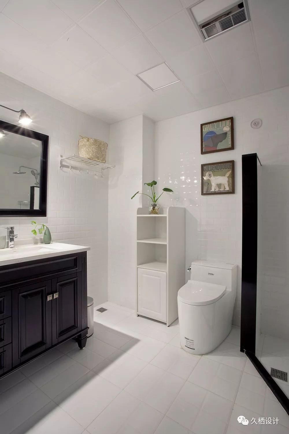 围合感强的半高淋浴区,做成了半开放式,与其他洁具功能摆放在一起,也能达到轻盈宽阔的效果利用黑色石材在过道部分做了圈收边跟挡水沿,提高功能的识别度