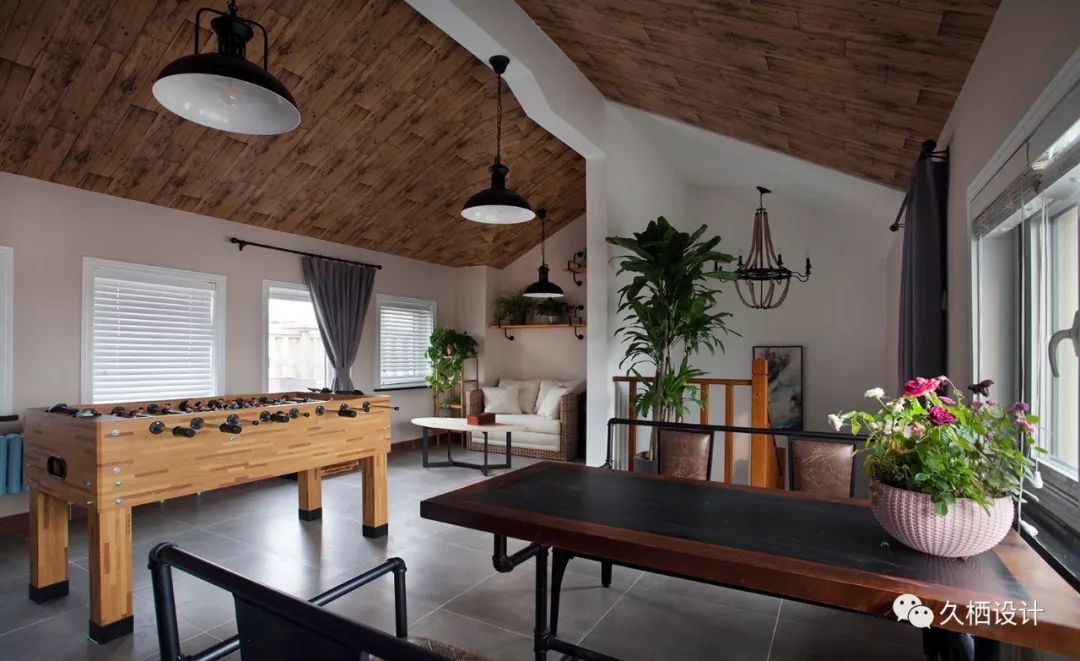 娱乐室主要有茶点,休闲功能本来男主人之前是考虑打国标台球的,怎奈横竖摆放,挥杆都困难,最后改成了桌上足球机,平时也能玩得不亦乐乎顶部的坡屋顶有很多高低错落的顶角,考虑到找直,或用板材搭建会降低原本净高的优势,还会有不菲的造价,建议选择接近真实质感纹理的木纹壁纸,最终效果无二差这么隐晦的解密,我不说,你能看得出来不?