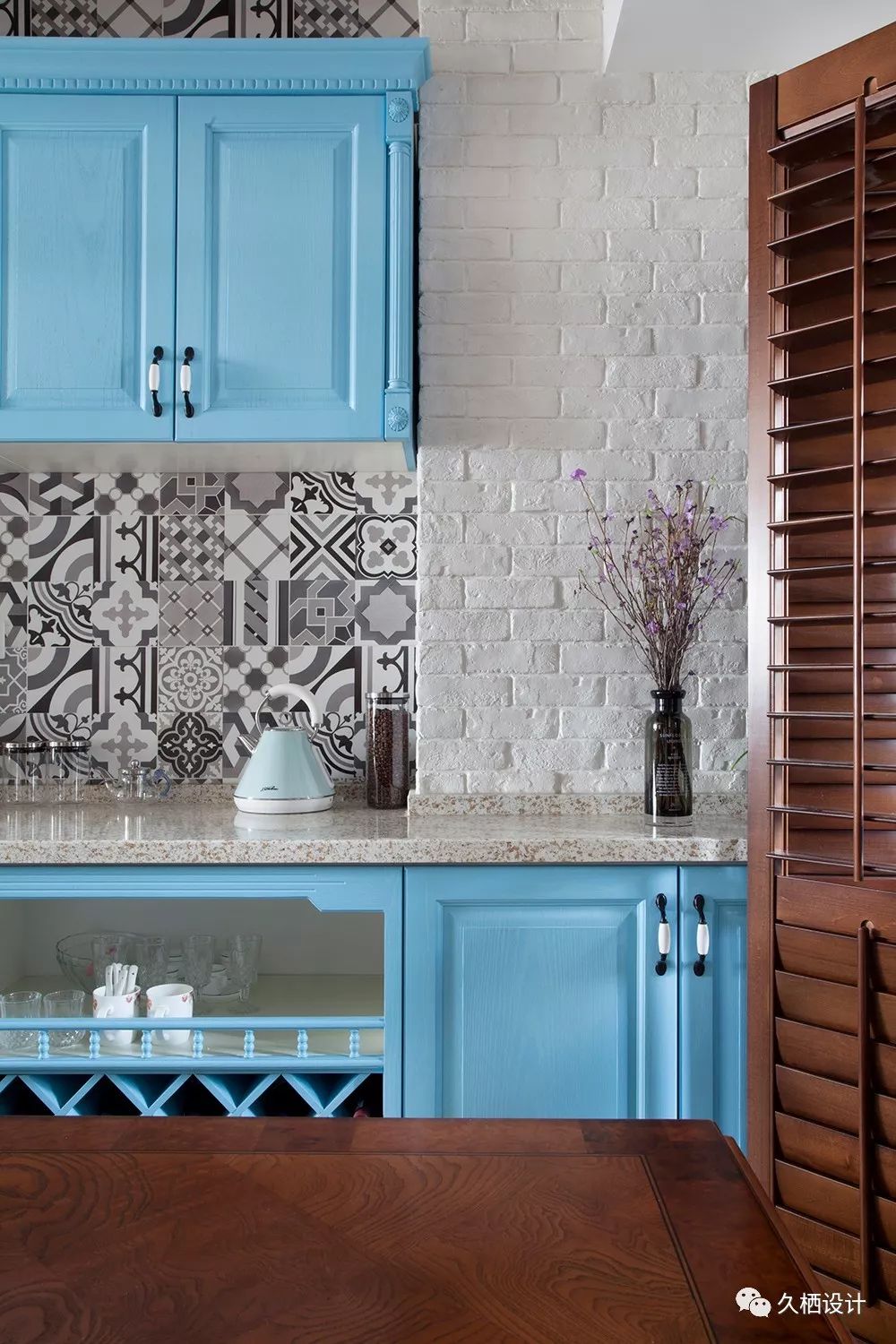 灰蓝色的橱柜搭配白色文化砖,在设计师的手笔下显得质朴而又素雅像是空间中一道不可或缺的艺术品