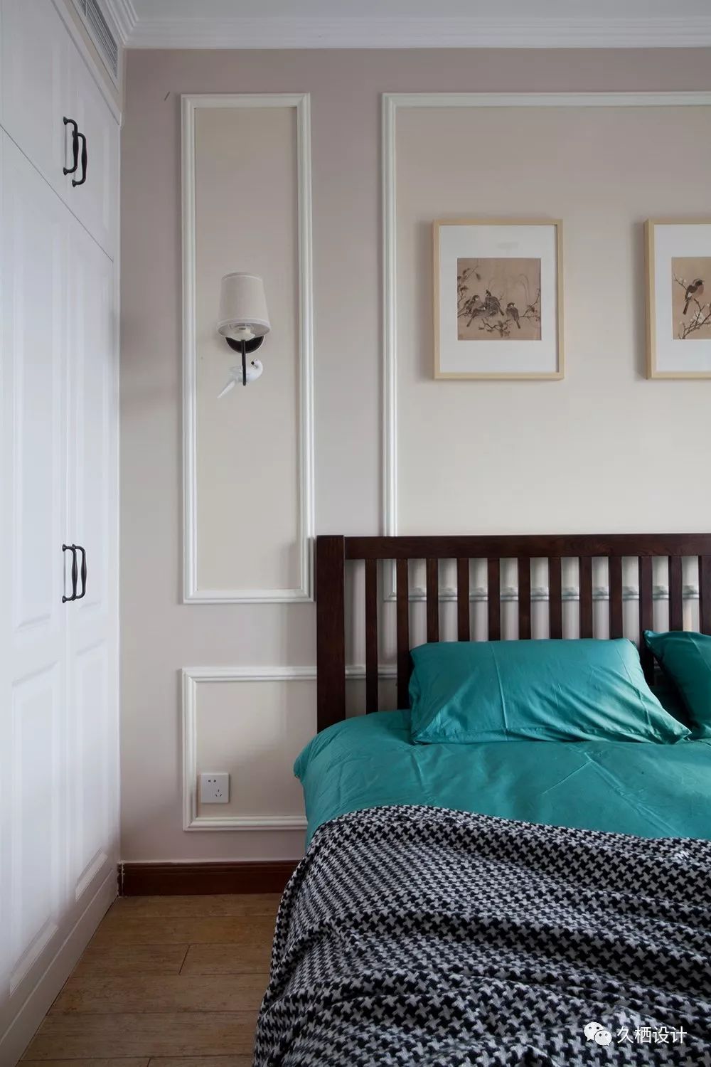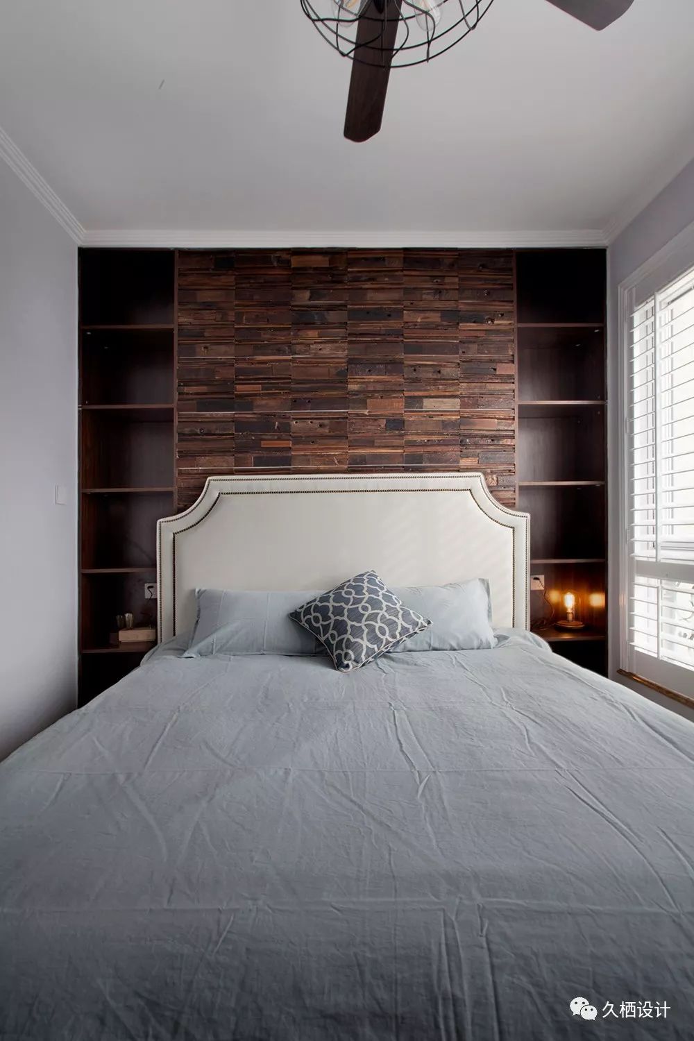 床头的碳化板与两侧对称的储物柜一气呵成,掏出来的背面就是走廊里的书柜当初的设计效果,工人师傅一片片的挥泪铺贴,加上屋主的一再坚持,最终完成让大家都很欣慰值得一说的是,这种碳化板除了长度统一以外,厚度跟宽窄都是随机的,喜欢的小伙伴要打出一百分的精神,注意平时的擦拭搭理,或者给自己家的保姆加点工资两侧的书柜在离床板最近这一层,注意好预留的高度,不能一味均分,不然常规的台灯高度是没办法放进去的