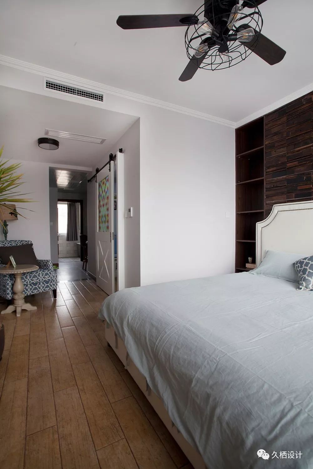 穿过中厅,推开谷仓门就是里面的主卧,层层递进的布置,给人感觉里面别有一番天地