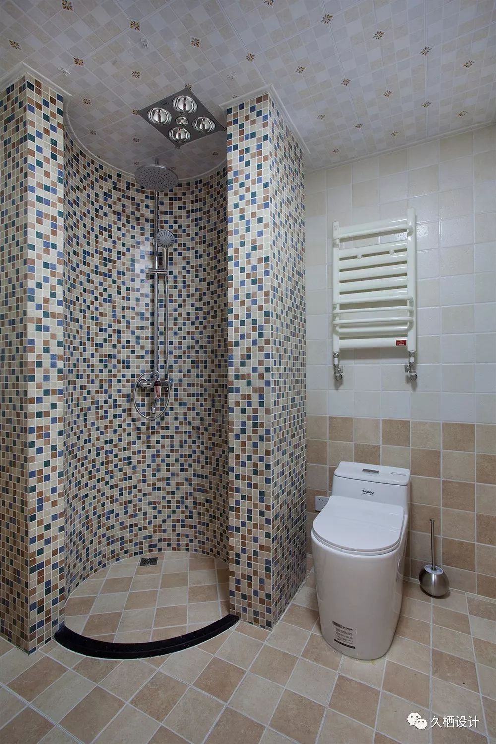 卫生间弧形淋浴房的设计为日常的搭理提供了便利,马赛克无疑是这里最适合的材料