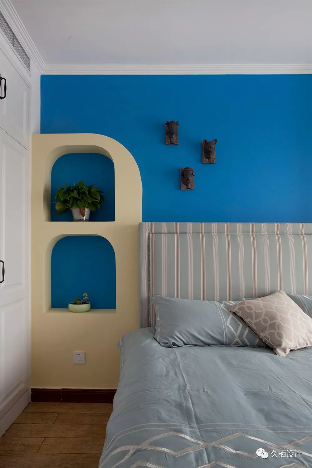 儿童房的造型墙高矮错落,中空掏出的部分省去了床头柜的位置