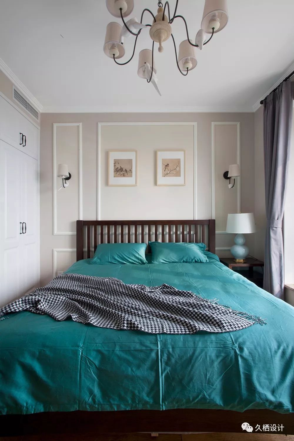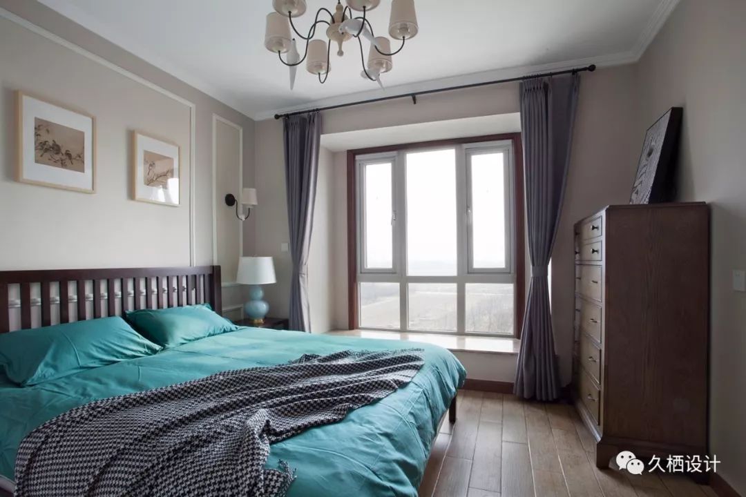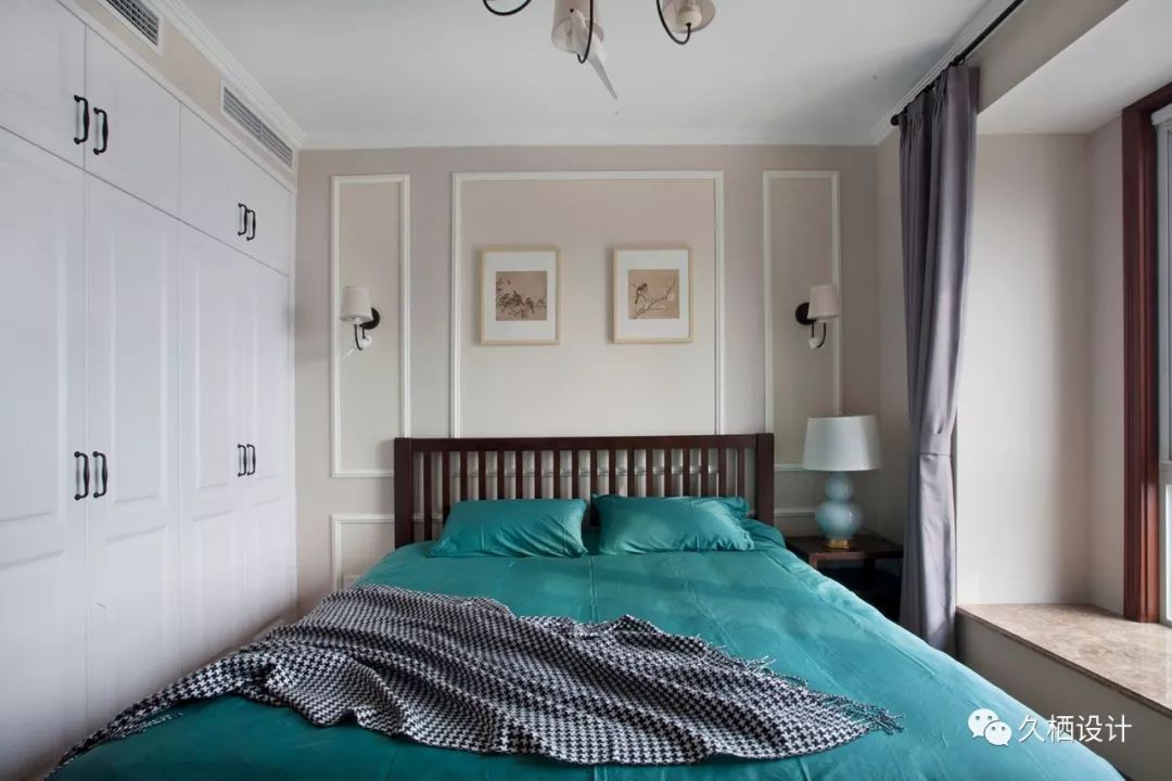 空间的弱饱和用色衬托出,纯色的墨绿床品简洁的色彩对话,没有丝毫的造作感