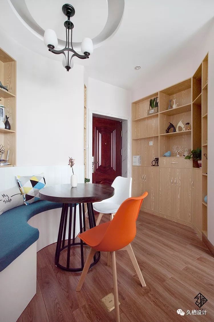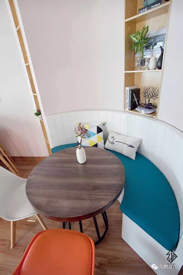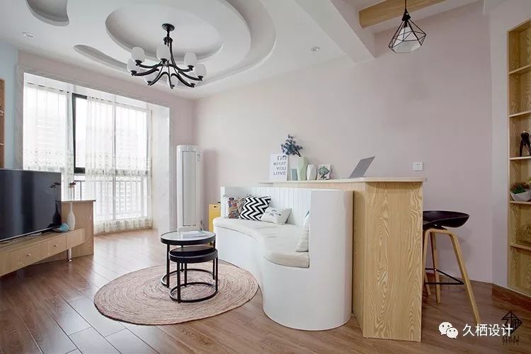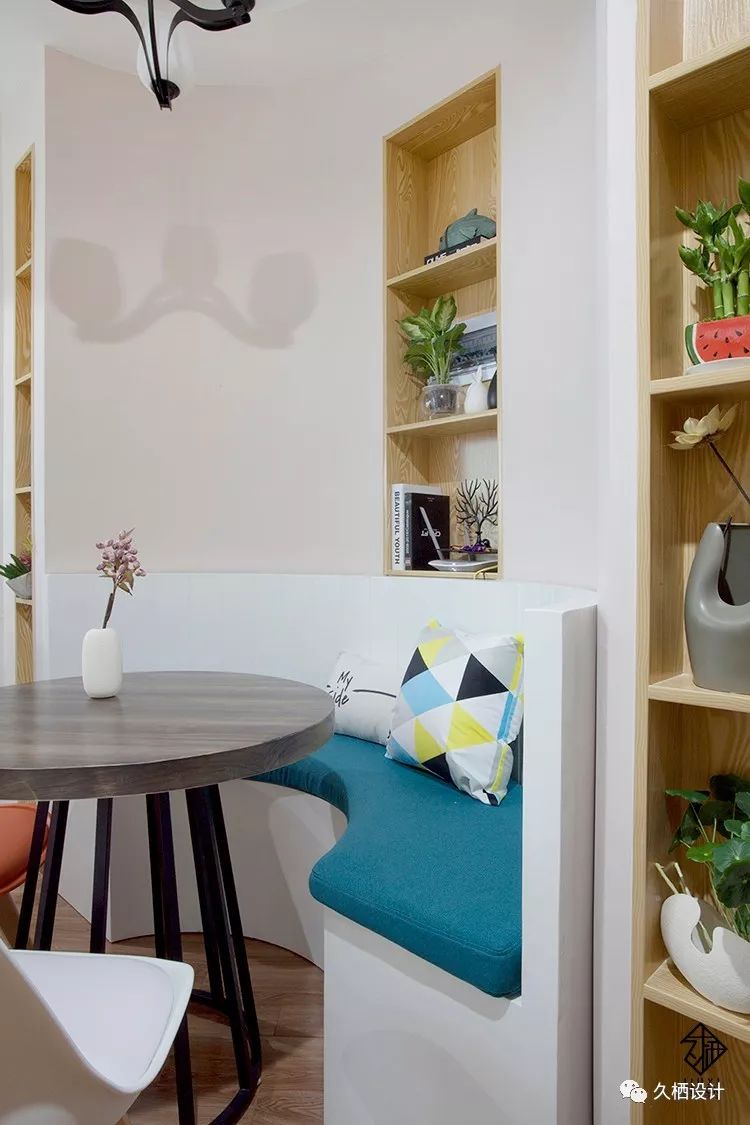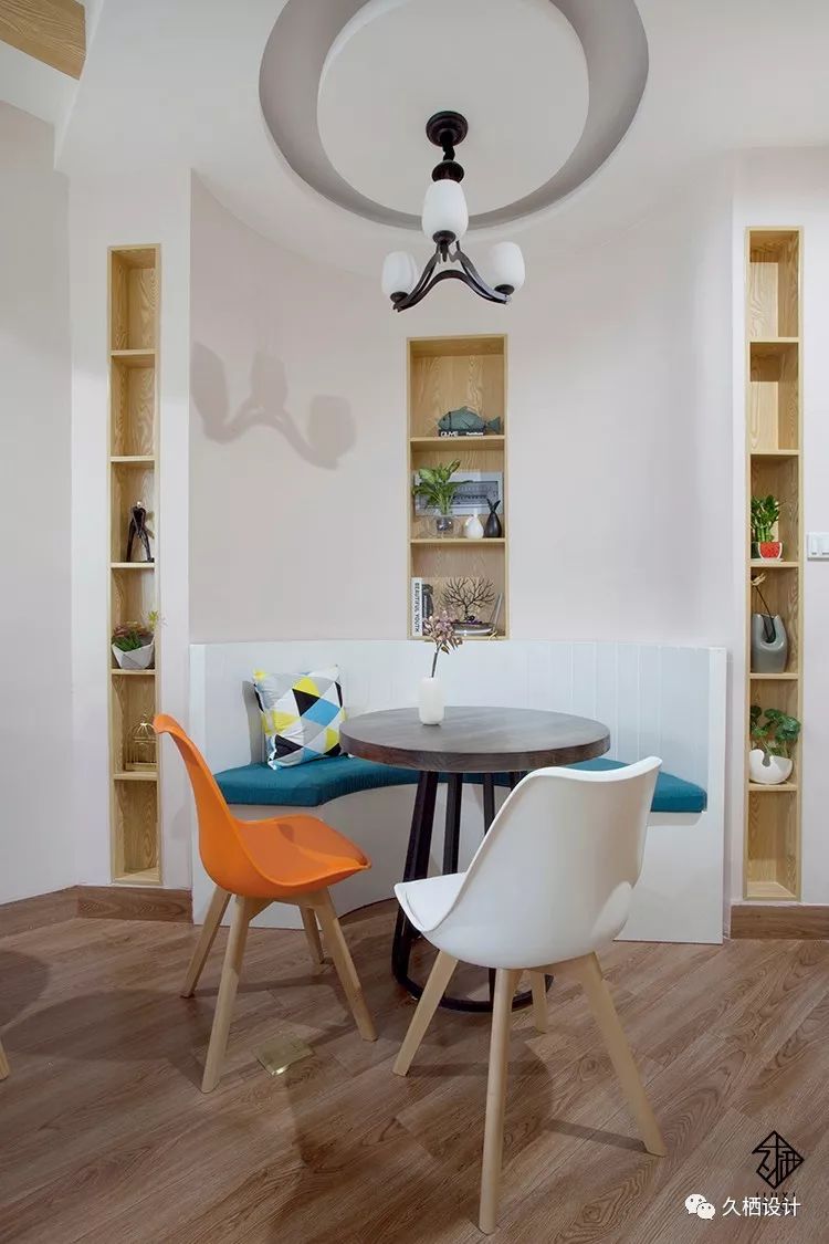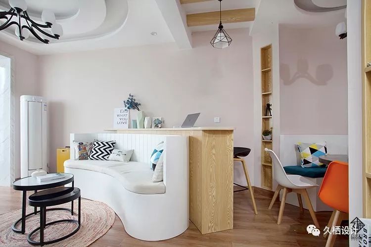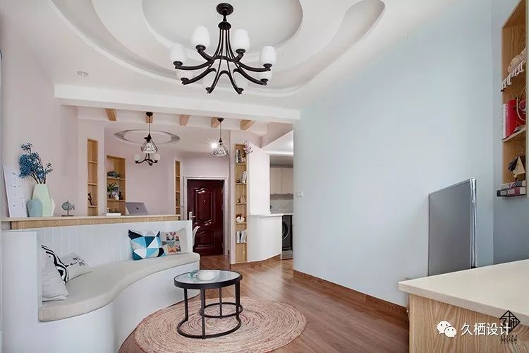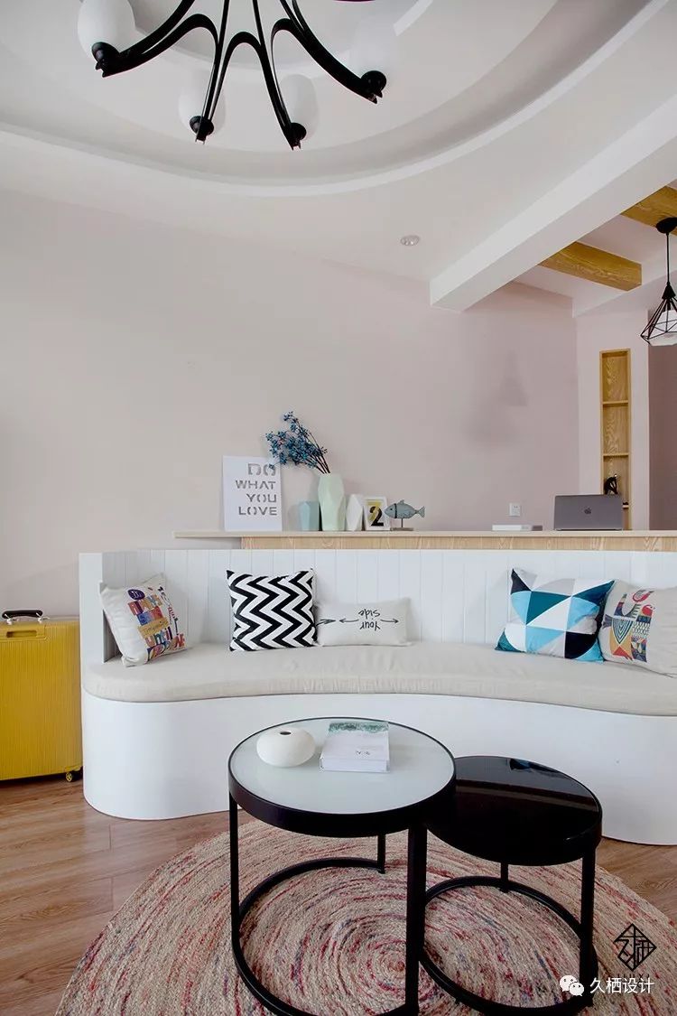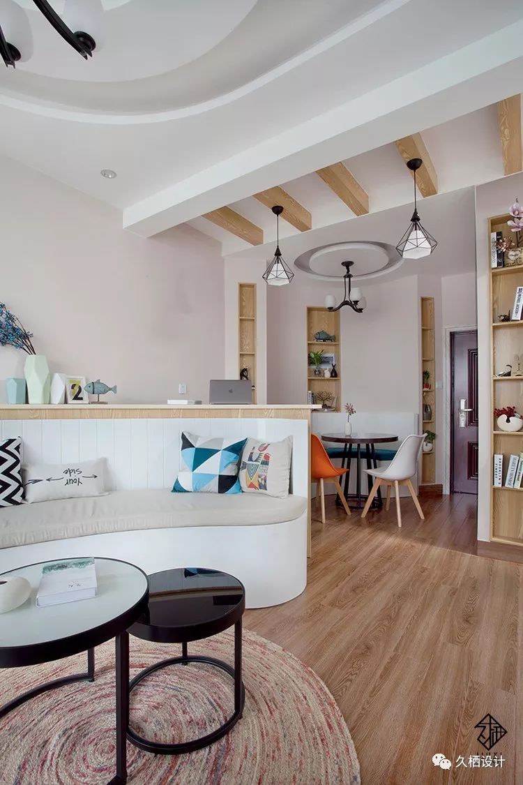以弧形为主的设计,让这个60平米的小房子有效得到释放,宽敞不拥挤