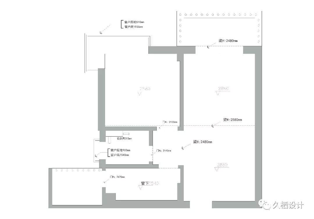转角的电视墙,巧妙的利用阳台处原有的配重墙做延伸小格子凹龛的高度,正好避开电视探了出来