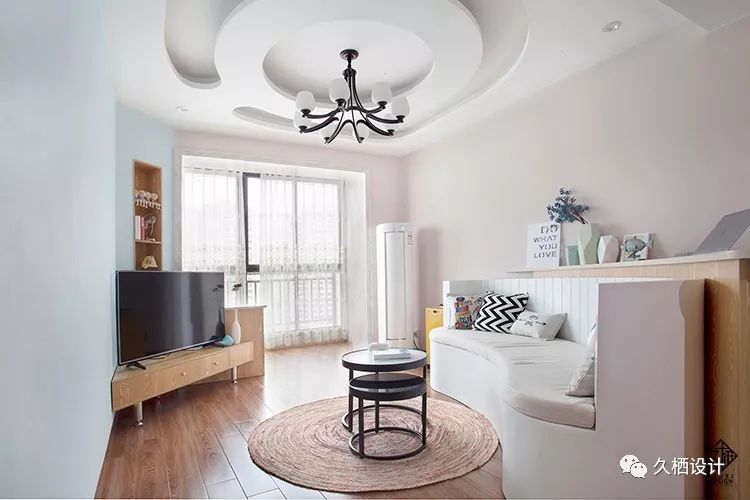 客厅依然延续圆弧的处理方式,巧妙的利用半高家具隔断增加空间通透性