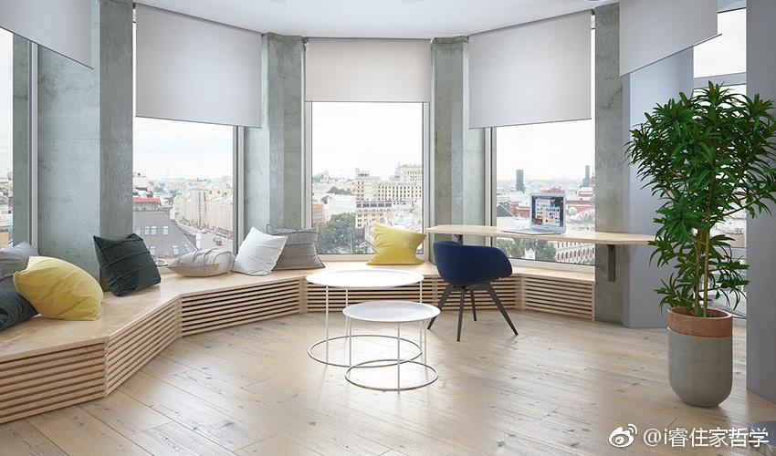 我喜欢这样的家 乌克兰 LeoDuk 设计工作室便将屋内隔间依照建筑轮廓做回字型配置,客餐厅作为空间主定位,再从外围的八角凸窗作为起点,利用低矮卧榻环绕而起,保留自然光线并成为一处可惬意工作或简单会议的场所,厨房则切齐墙面同时将走道连结至卧室处,再运用半透黑玻璃隔绝公私领域;卧室将不规则窗边量身定制成可轻松阅读、工作区域,整体空间不仅拥有流畅动线更增添实用性。