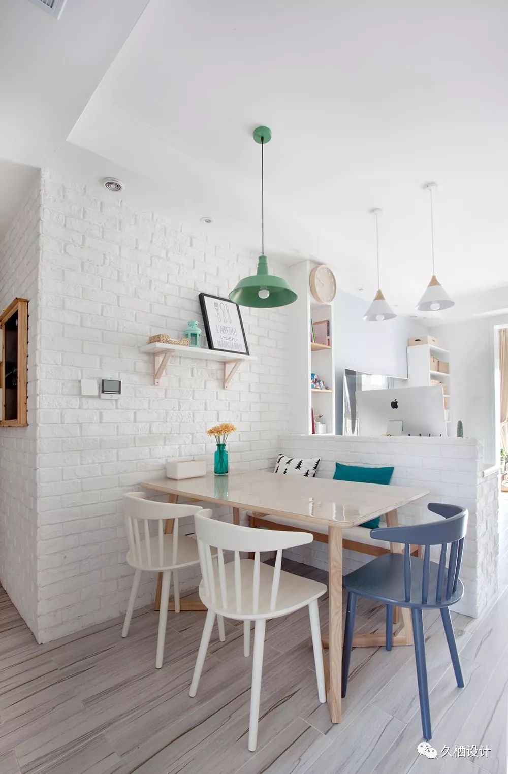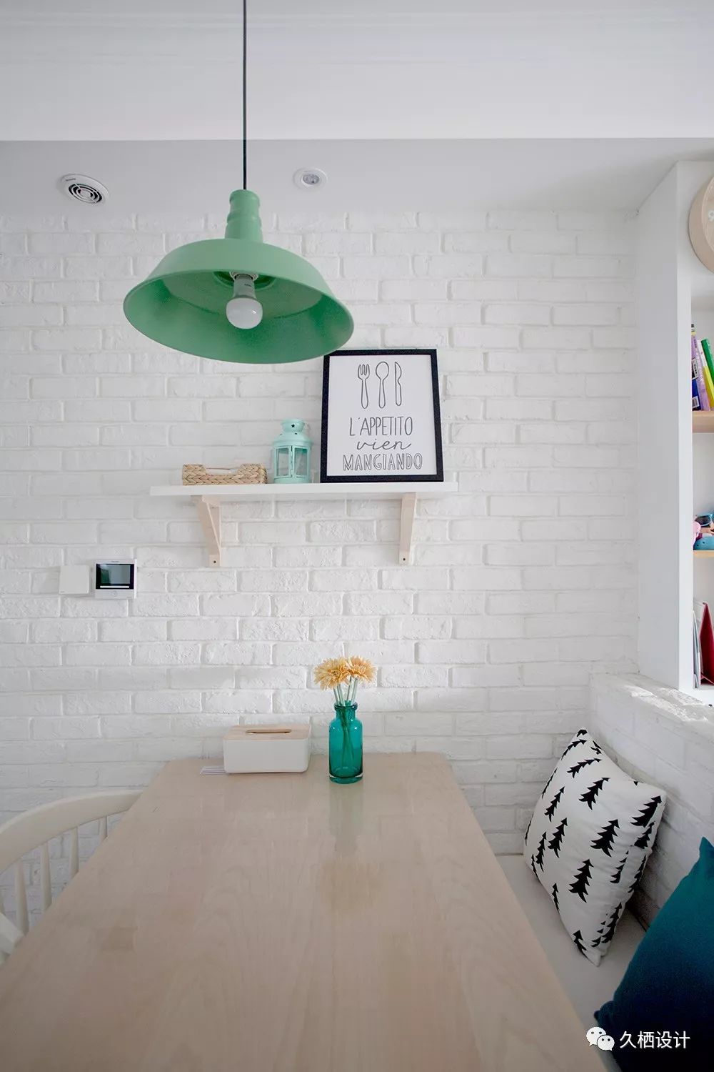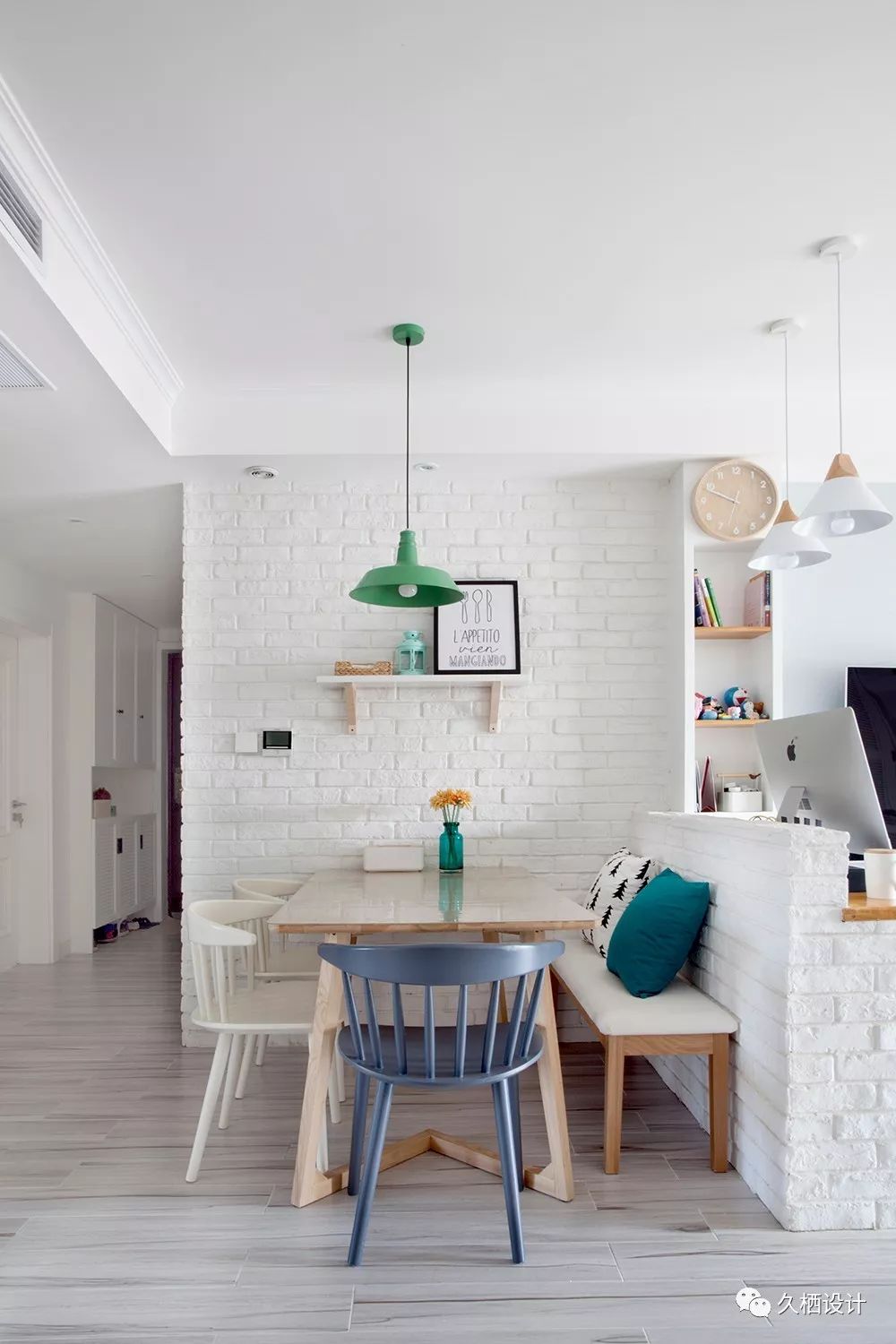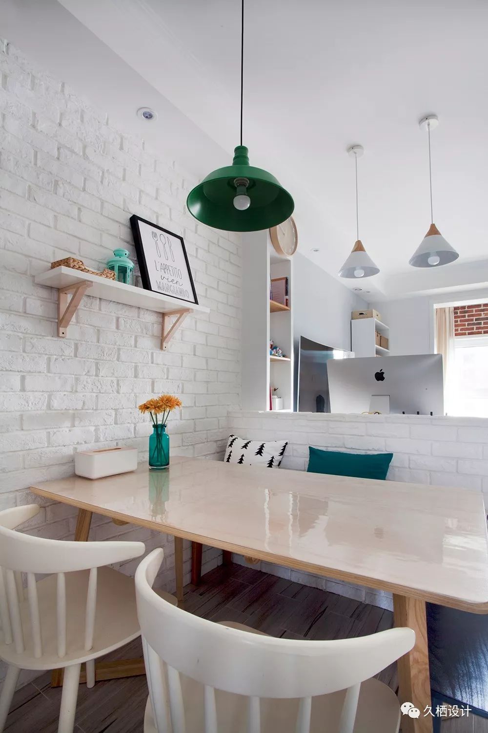 质朴的白色文化砖与纯色小吊灯是餐厅的亮点卡座就餐的形式既保证餐厅具有充足的功能,也不会让客厅空间显得拥挤压抑卡座背后依靠的半高墙是书桌,开辟了一处简洁且温馨的休闲工作区域,相当节省空间