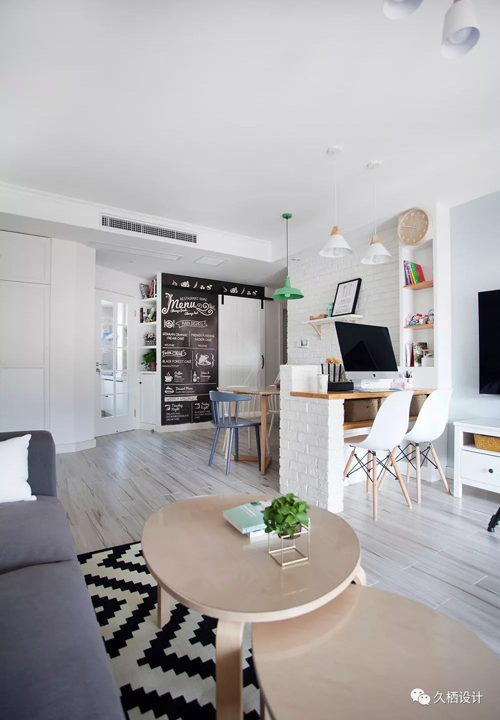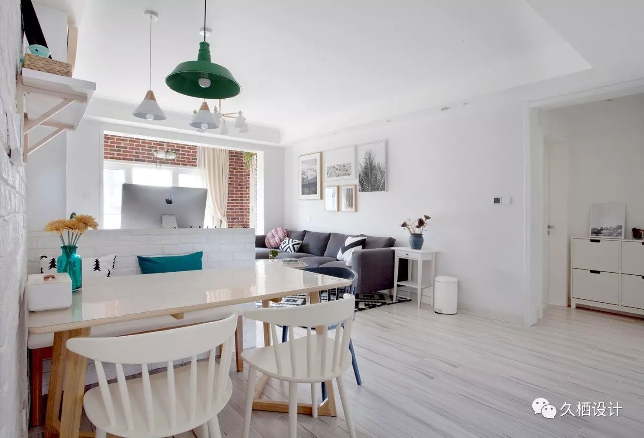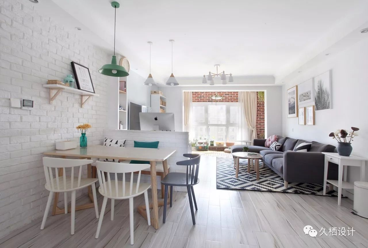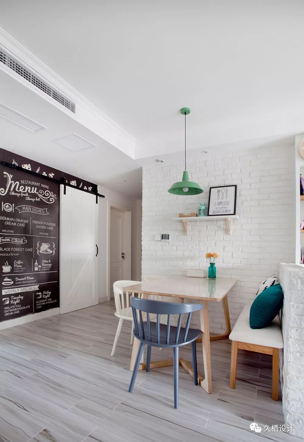质朴的白色文化砖与纯色小吊灯是餐厅的亮点卡座就餐的形式既保证餐厅具有充足的功能,也不会让客厅空间显得拥挤压抑卡座背后依靠的半高墙是书桌,开辟了一处简洁且温馨的休闲工作区域,相当节省空间