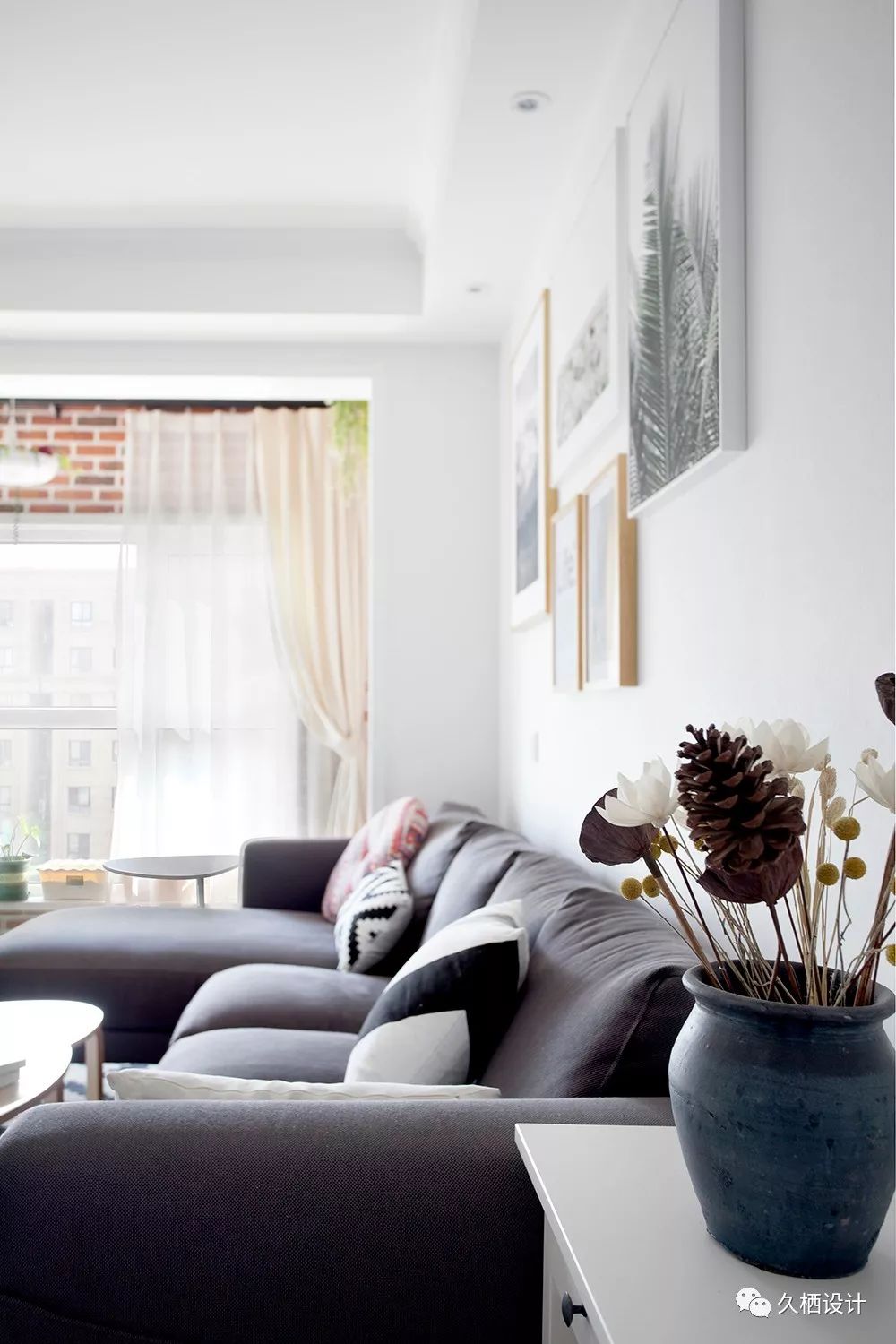 软软的L型沙发真是想让人忍不住想在上面瘫上一天沙发旁边摆放一个简单边几与花瓶,不需要其他装饰,就已经让人感觉很有格调了