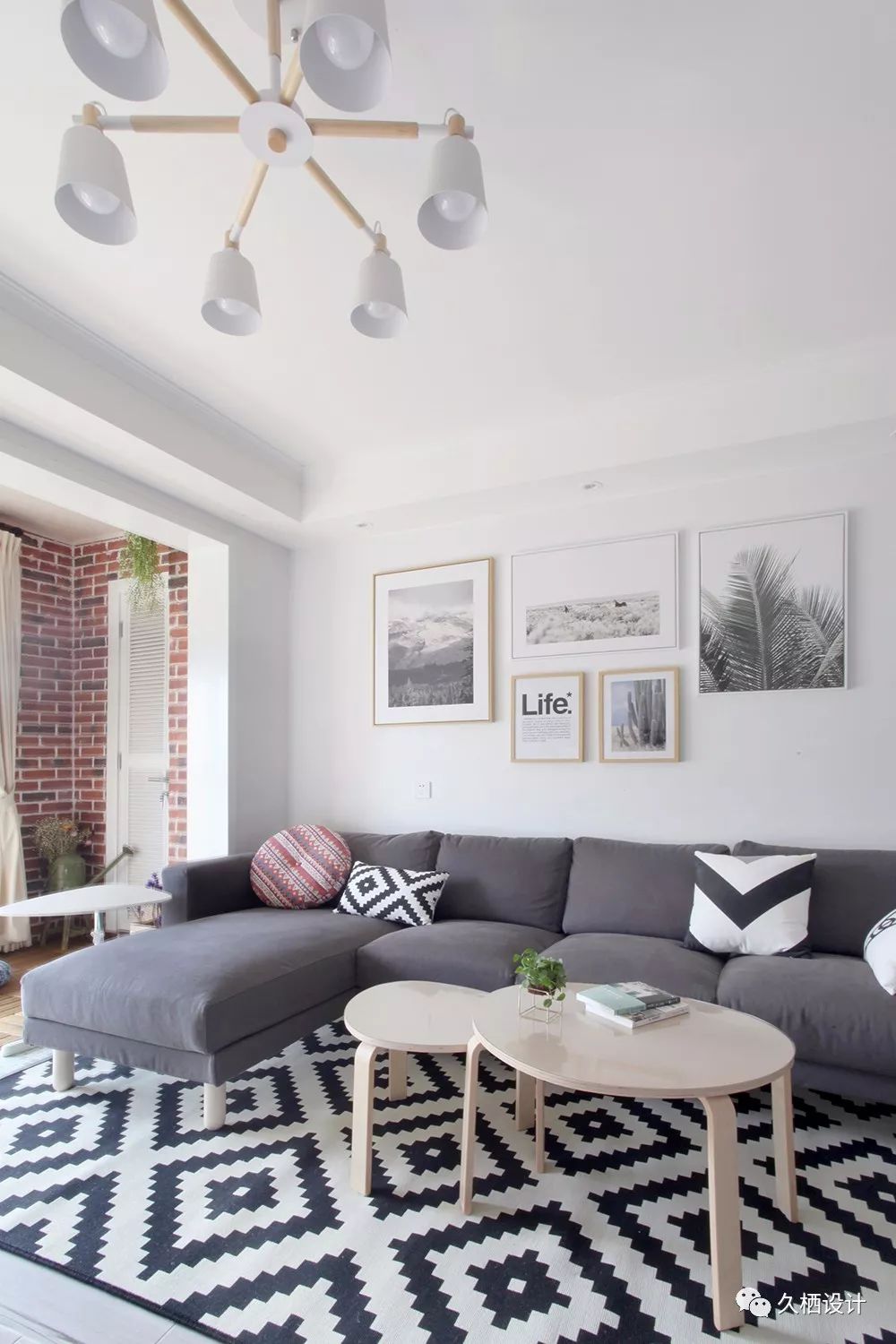 白色的吸顶灯与地板,散发着别样的生活味道双组木质茶几简洁干净,经典百搭低调不张扬,而且放在沙发中间不会占用太多空间