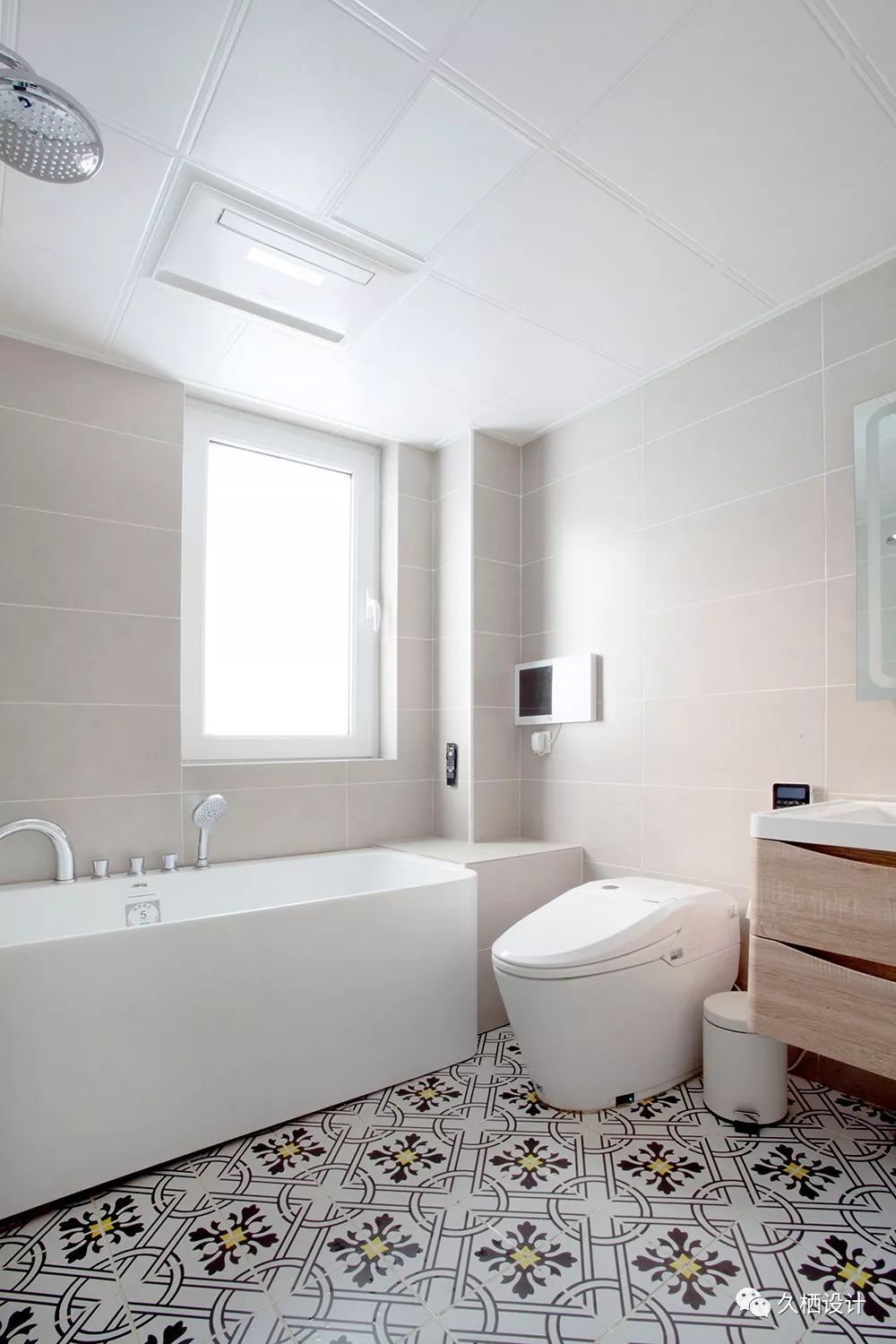 奶白色的墙砖与地面花砖搭配,使整个卫生间看起来干净清爽累时在浴缸里泡上一个舒服的澡,出去一天的疲劳,睡在里面就感觉很放松,倍感舒适