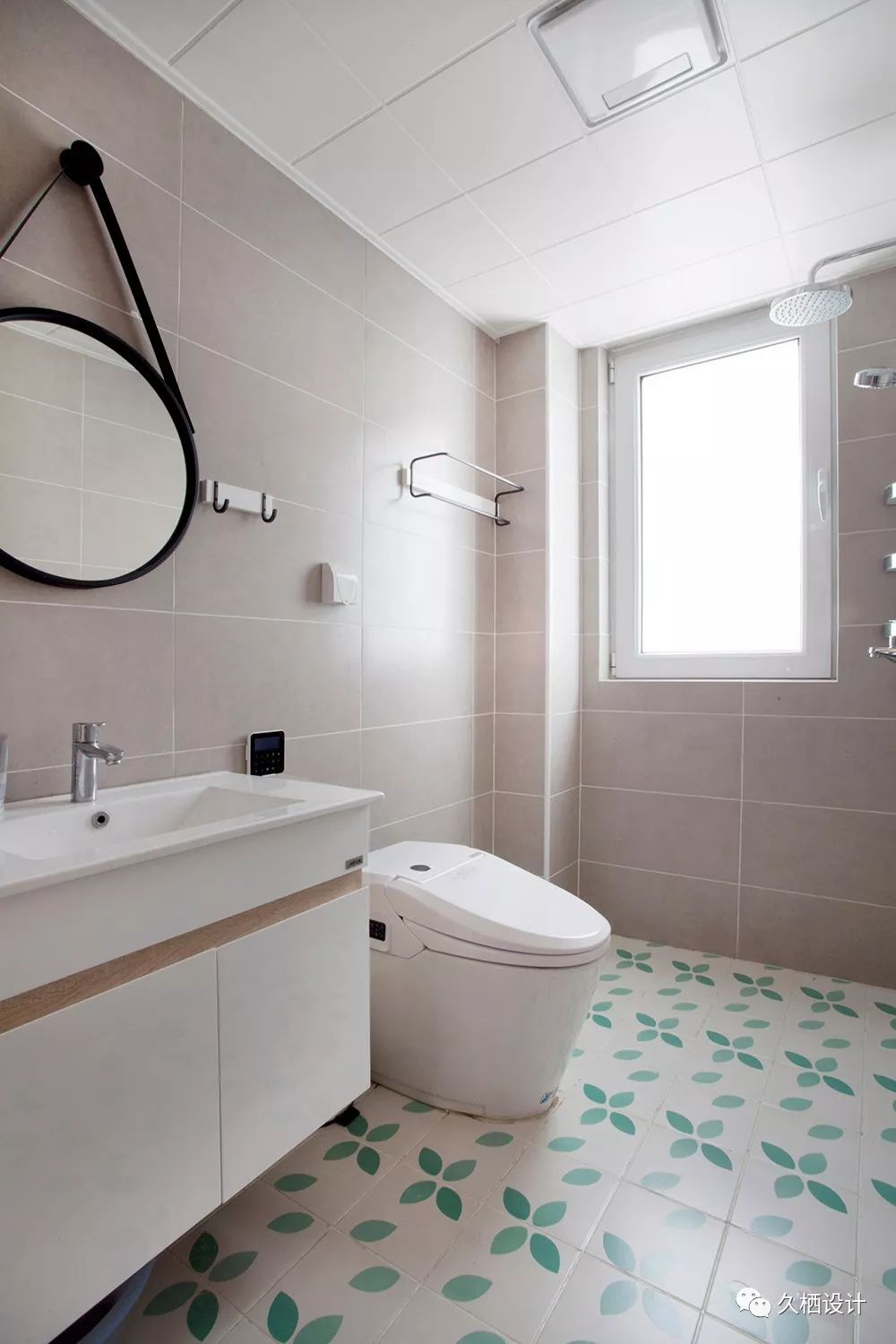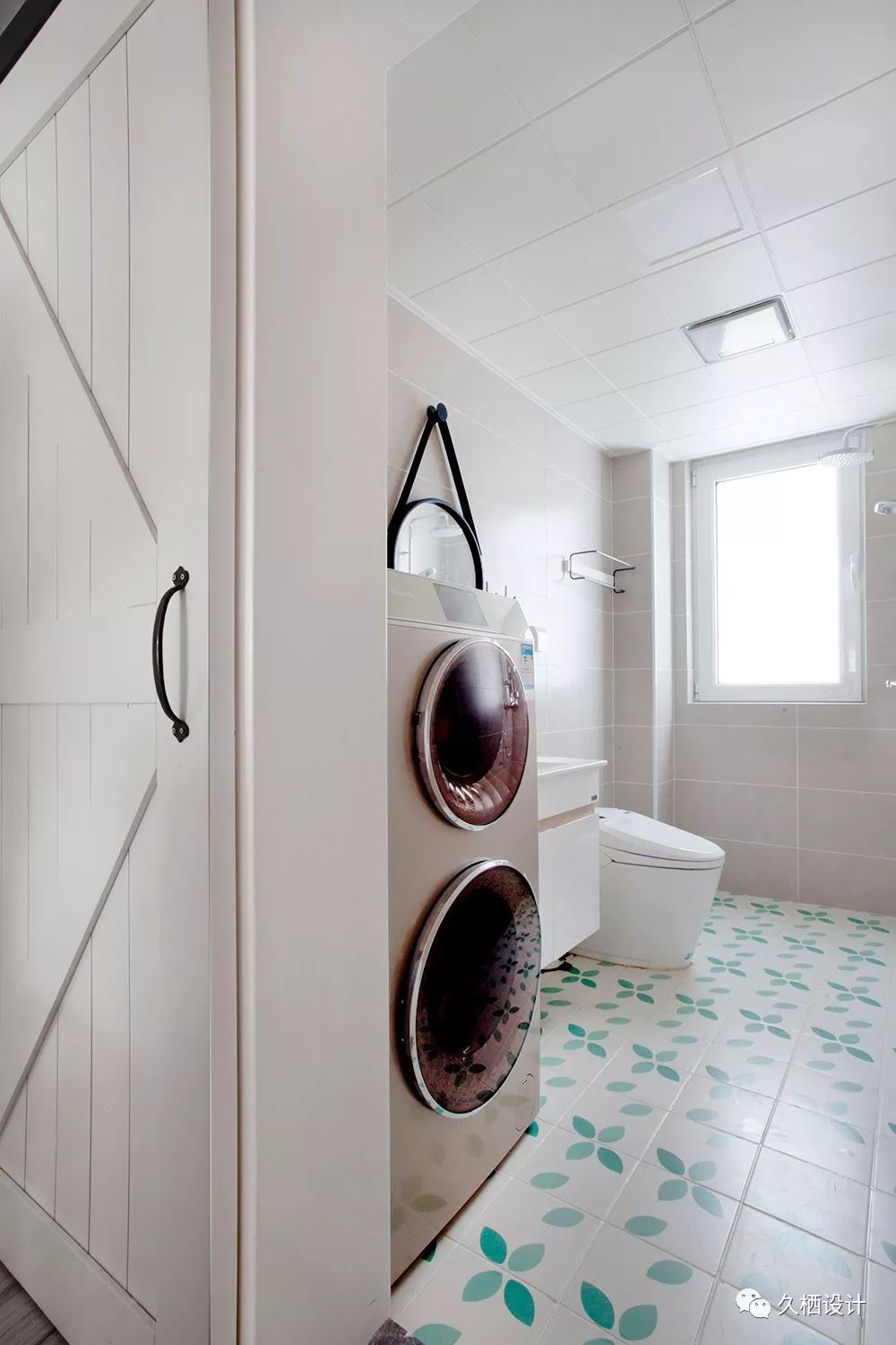 卫生间处的地面花砖清新怡人,带有烘干功能的双层洗衣机让功能更加丰富这样简洁有自然的卫生间环境,有着清新北欧风格的独一不二灵魂