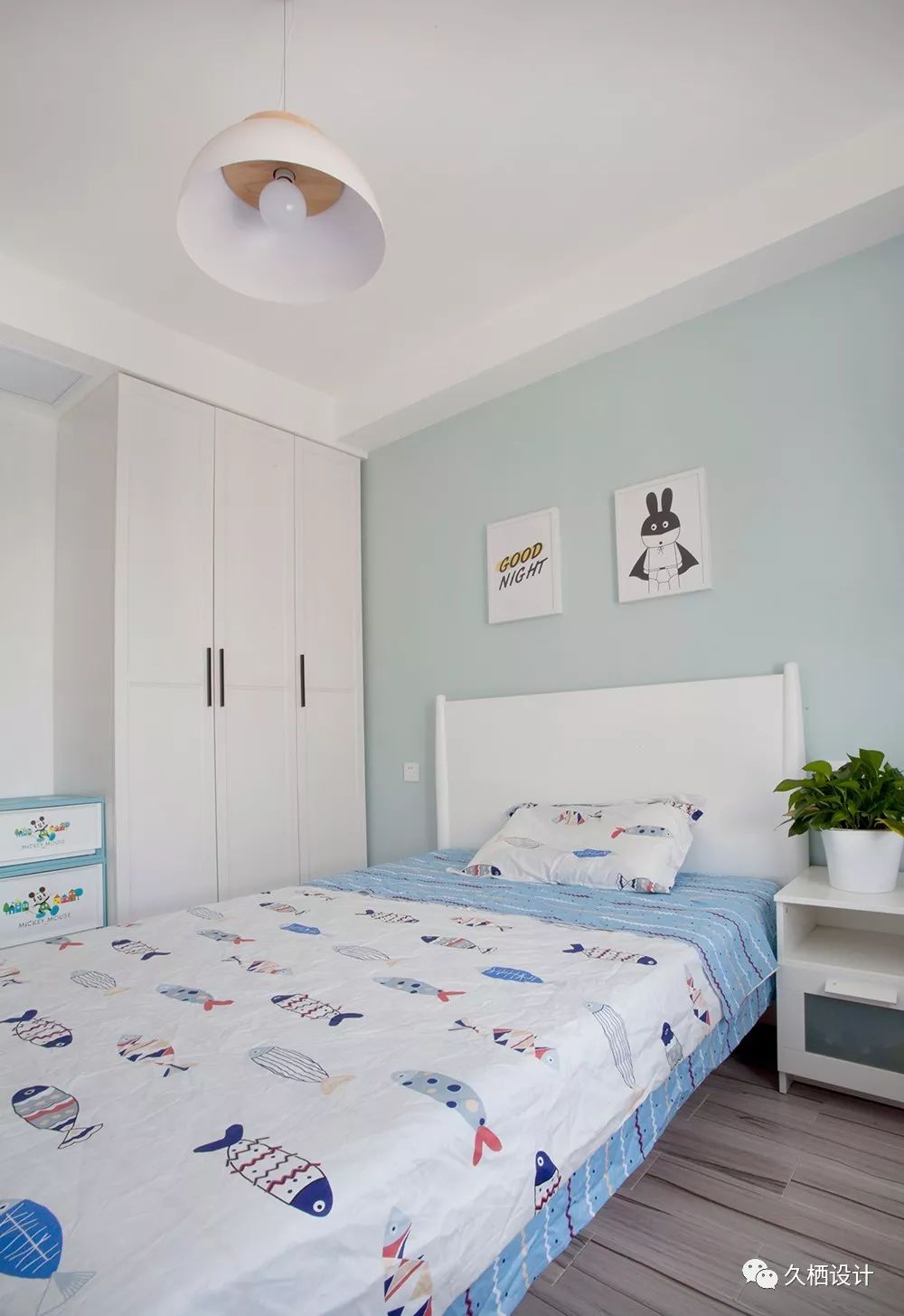 简洁中拥有细节,淡绿色的床头墙挂着两幅可爱的装饰画,淡蓝色的床品更适宜睡眠