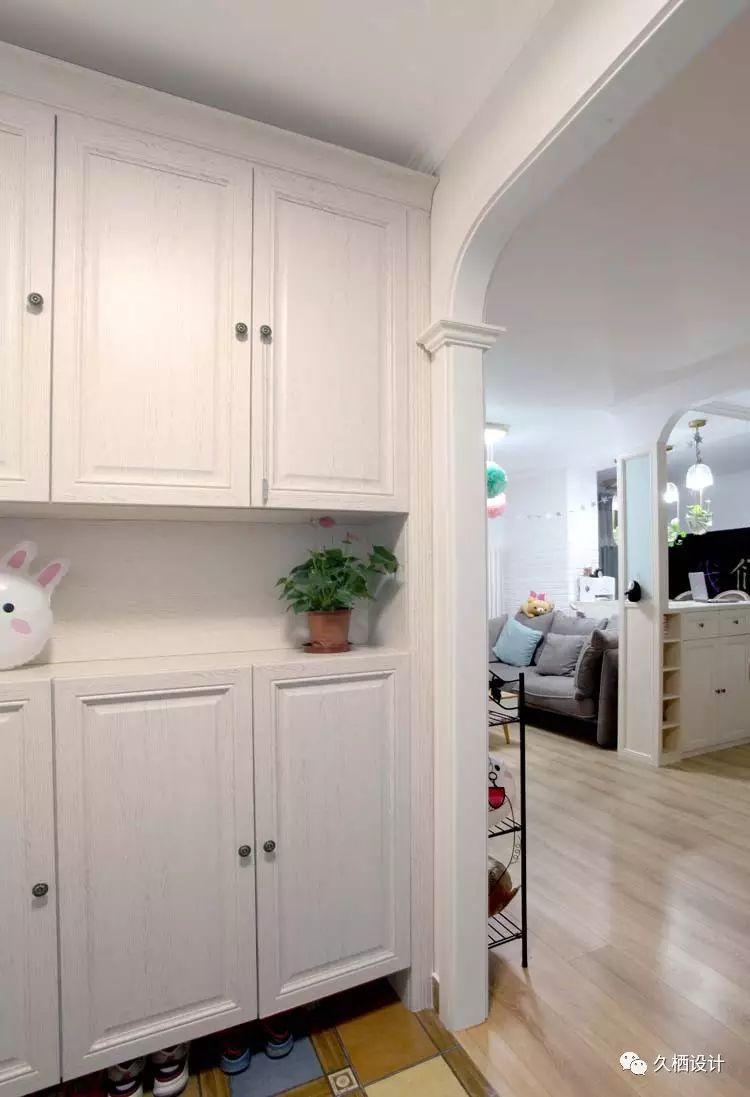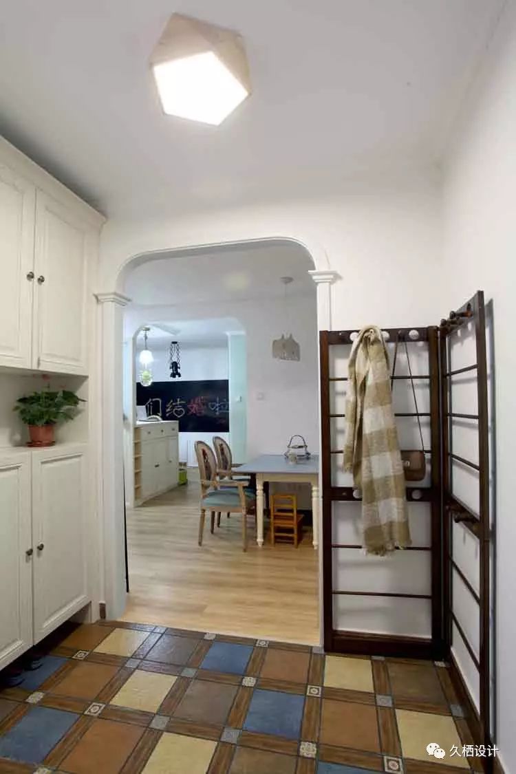 复古文艺的地砖搭配原木色地板,区分开玄关区域,大大的玄关柜能收纳大量鞋子和杂物,超级实用。