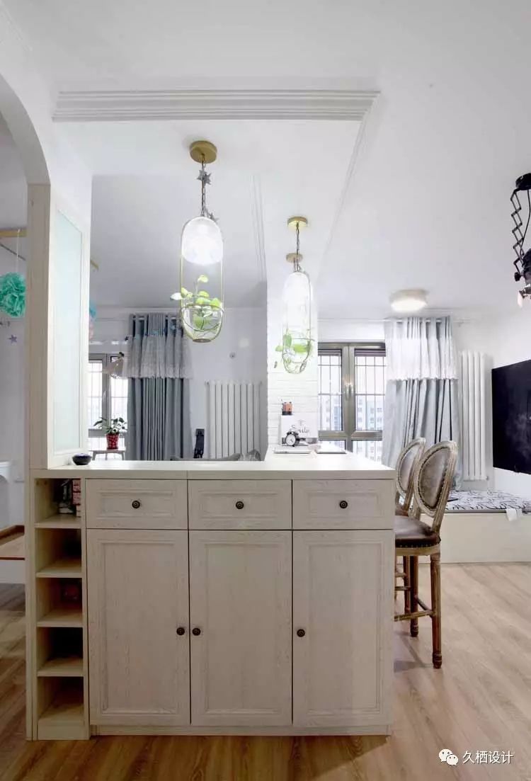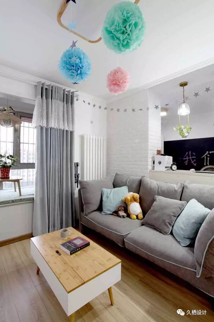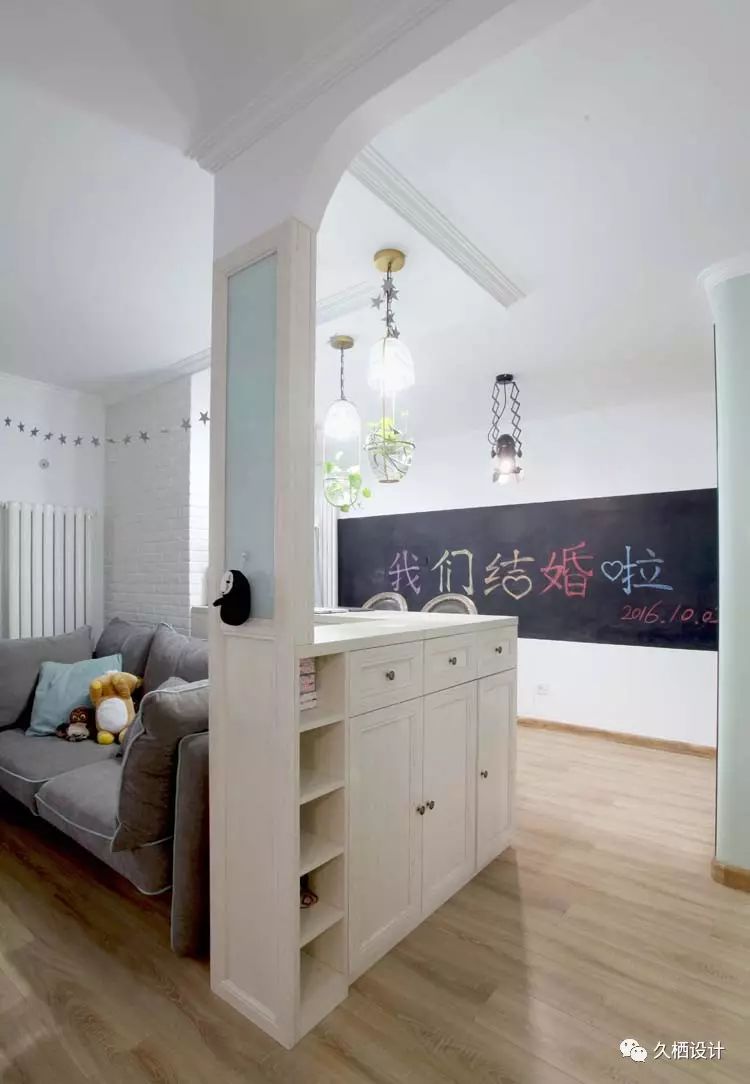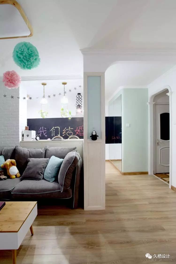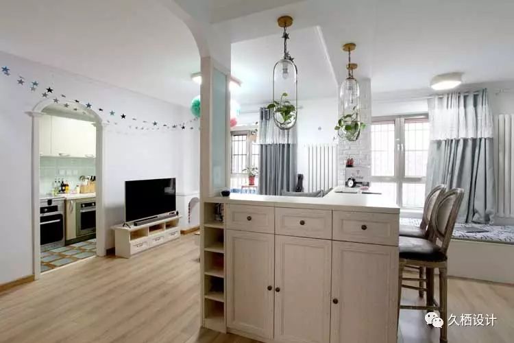 业主是一对年轻夫妻,打算利用原来的老房改造近十年前的装修风格,打造属于自己的两人世界,由于需求量较大,设计师在格局上重做调整。利用原来的一间卧室打通与客厅的联系,以似分隔未分离的方式,将鲜活的临近主题色延续在每一个空间当中,朴实质感的砖片造型墙与木质吧台相结合,围绕在舒适的沙发旁,不禁让人驻足停留。室外的清心空气随风穿堂过室,不受约束的贯穿空间中每一道宽敞的过道,追溯着人们心中对风雅玩趣的生活向往——来源久栖设计TopDesign︱旧屋换新话说这样的二人世界就是要把生活整理成自己喜欢的模样