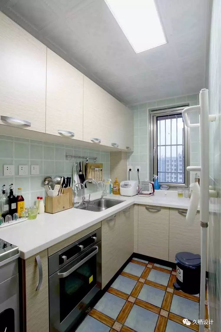 清爽的蓝色墙地砖,米白色橱柜,厨房面积不大,营造出浪漫温馨的感觉