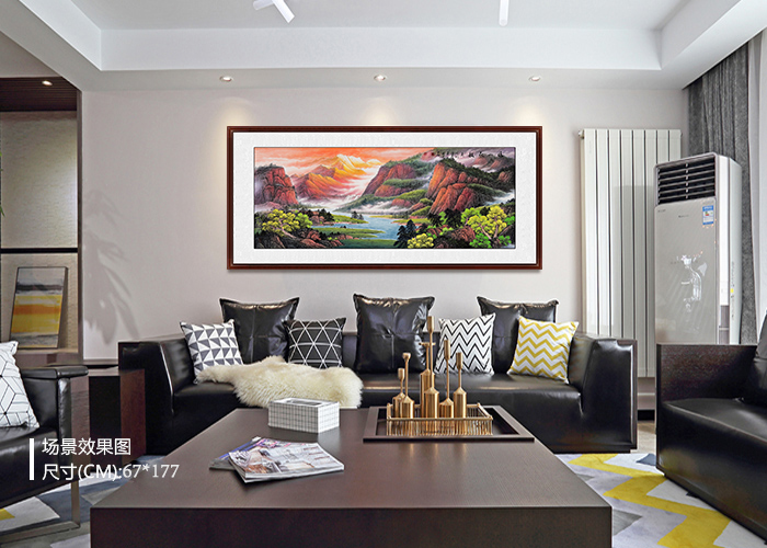 4、营造富贵气息,改善运势。客厅中挂字画,在这个会友待客、家人欢聚的空间里,除了反映居家主人的爱好,也代表主人的主人的审美与品位。同时对提升家居气色,营造富贵气息,起着极为重要的作用。因此,将吉利字画作为家里的装饰画,悬挂于客厅以求锦上添花、旺上加旺,是良好家居的布局方法之一。例:在家居东面墙上挂一幅带有日出的山水画,则有旭日东升之佳效!国礼书画家张利经典风水画《旭日东升》 作品来源:易从网