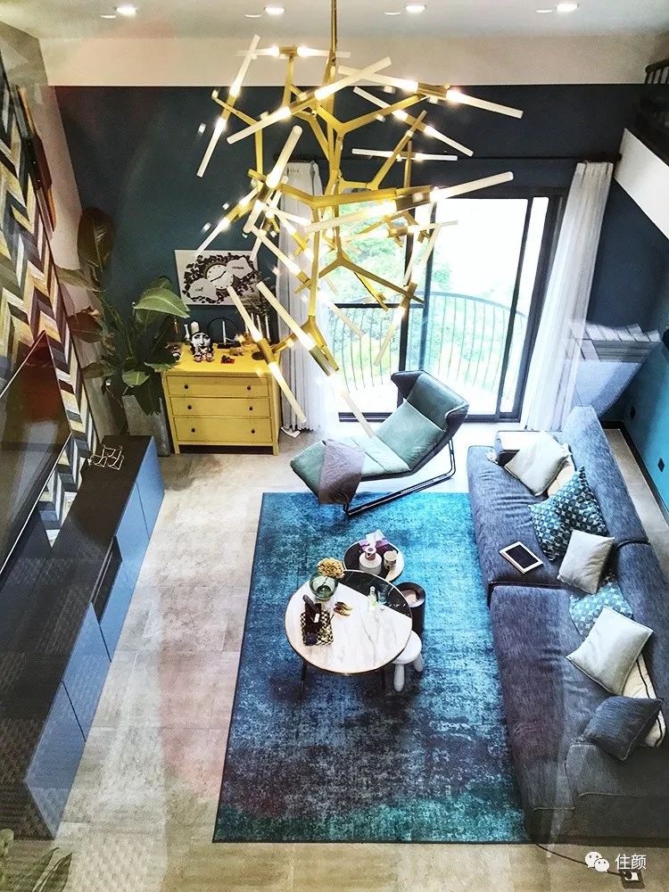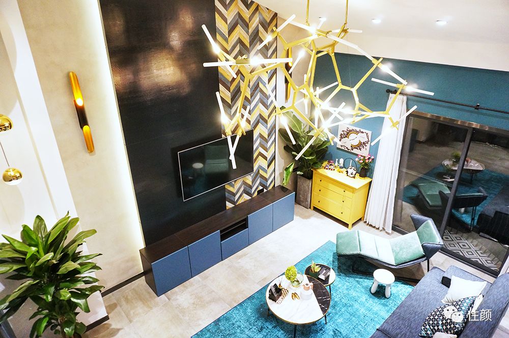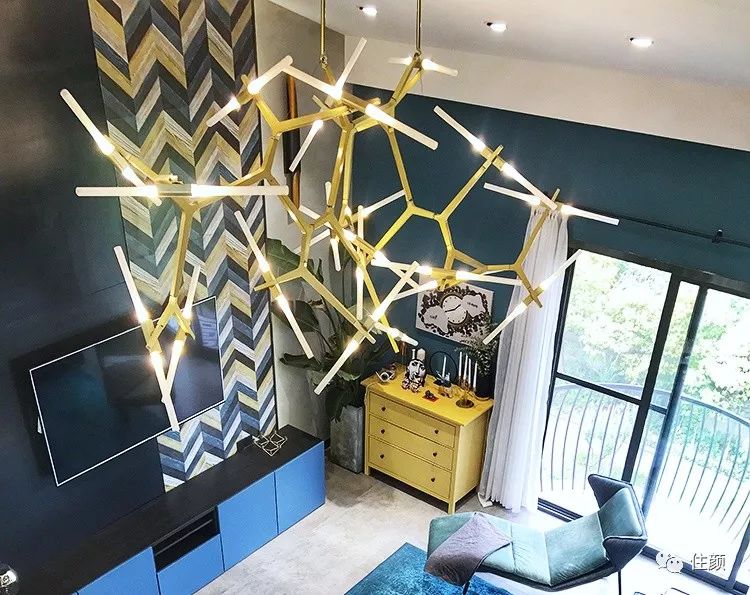 xidylee 的客厅,以冷色调,黑、灰蓝、墨绿来作为主色调,同时以三屉边柜的明黄和金白组合的吊灯来进行点缀,简单说,就好像是黑与金的组合,高级、利落,复古的感觉也能一笔完成