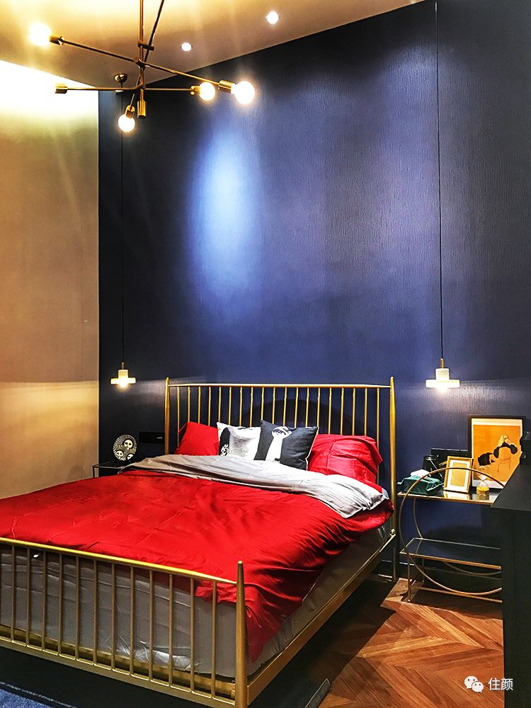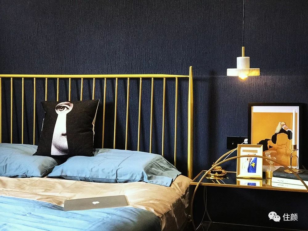 什么颜色的卧室,能让人觉得有质感又温馨舒适呢?在很多人还在选择冷灰色的时候,xidylee 使用了黑色作为背景墙,不开灯的时候,与金色的床和柜子形成对比,高冷复古