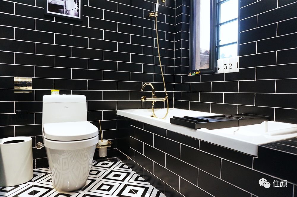 主卧的卫生间是黑白色系,通体使用了黑色的瓷砖,白线勾勒,浴缸与马桶的白色镶嵌在黑色中,地板也是用了黑白镶嵌的地砖,更是给浴室带来一种高级的质感
