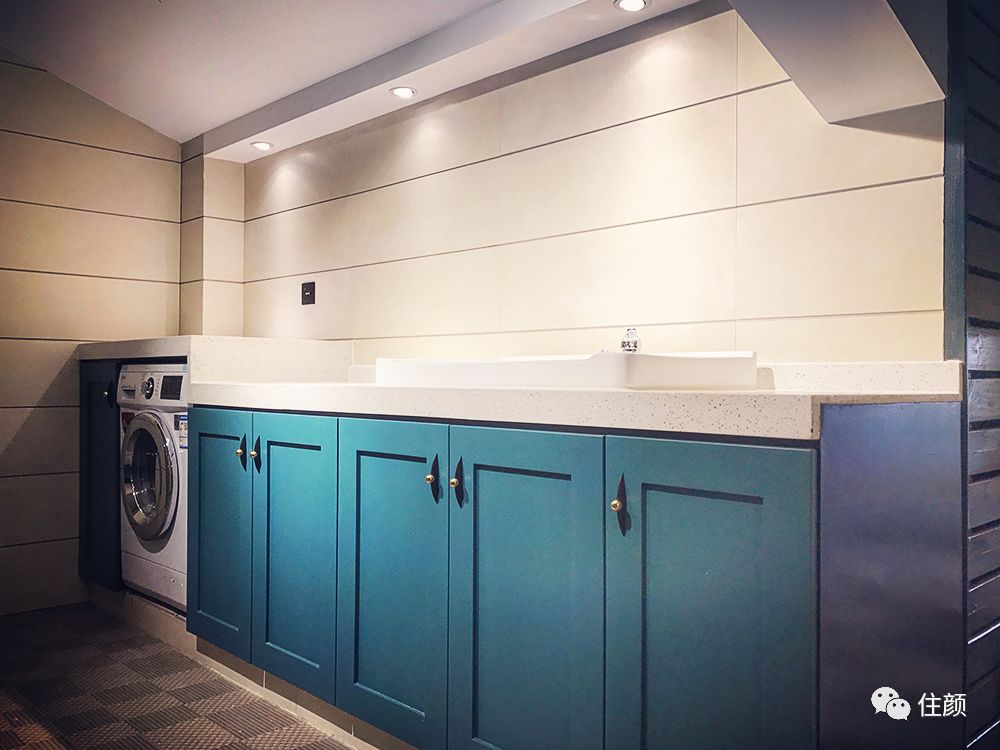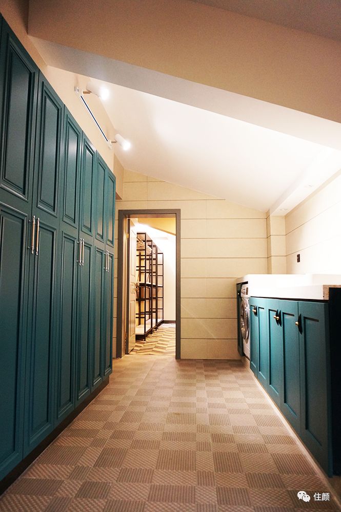 而衣帽间则与洗衣间合二为一,洗衣收衣,在这一个空间就能完成,衣帽间的颜色,使用了非常复古感的碧湖蓝色,搭配上银色门把,精致优雅