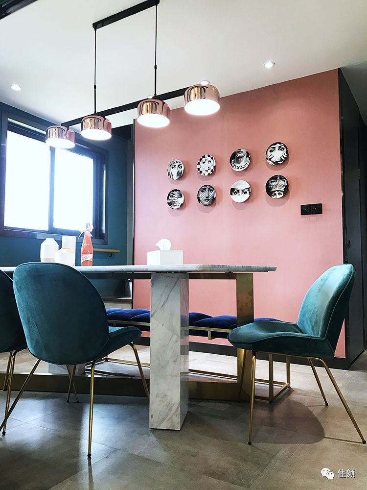 该如何搭配好粉色的背景墙呢?xidylee 用了红铜吊灯与大理石桌面,让窗下的餐厅区域变得更加明亮