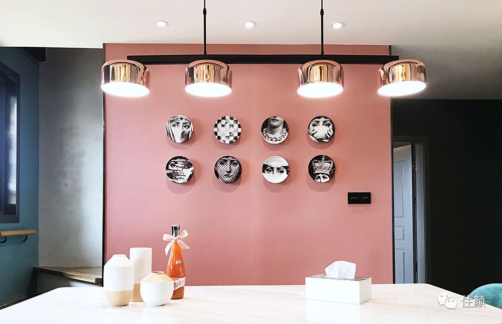 再在粉色墙面上装饰八只黑白色系挂盘,射灯照耀下,复古摩登感应运而生,与整个空间的氛围相称