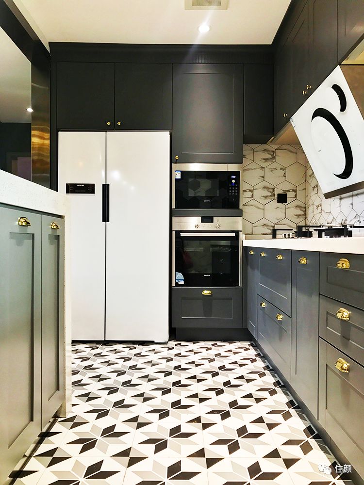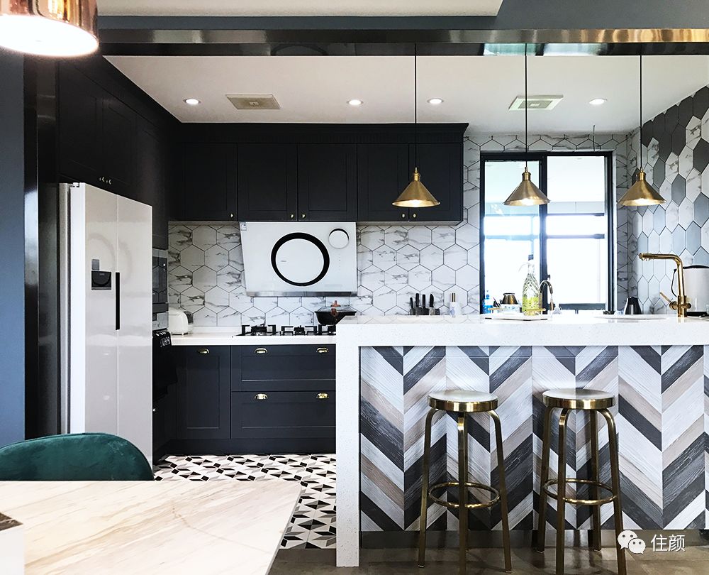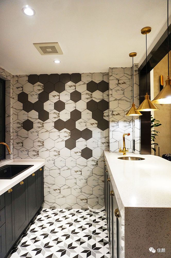 墙面上的「小动作」,对 xidylee 来说,是让厨房与众不同的重点,不用传统的仿瓷砖,六角瓷砖拼接,黑白大理石纹,再「皮」一下镶嵌几片纯黑色砖,和方方正正的橱柜、岛台对比,没了呆板多了些艺术感