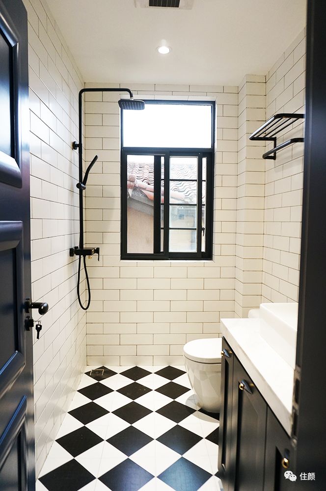 另一个卫生间,美炸的黑白对比,白色为主,黑色勾勒点缀,打开窗就能看到瓦片屋顶,很有风情感