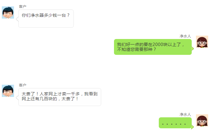 其实这样的事情基本天天都在发生,我们说1000块,客户一定会说还有500的;如果你说500块,他一定会说:“这么便宜,人家都要几千块,你的不会是假货吧!”净水器骗人的,根本没用的。这就是现实,产品不同价格绝对不同,净水器分为三六九等,因其成本不同,用料不同,故而价格不同;这是从质量没问题的前提下定义的;前置、超滤、纯水、全屋净水等等;——2013年5月3日壹周立波秀播出《波波谈水污染 等于喝农药》如果馒头长毛你一定不吃!如果肉有臭味你也一定不吃!如果饭菜馊了你肯定也会不吃!哪怕是汤里面掉了一只苍蝇,你也不会吃!但是为什么水污染了你却要视而不见呢?还在自己骗自己说:“大家都这样喝自来水的,都没事!”铁锈、泥沙、重金属、细菌病毒、红虫……太可怕了!有多少人还在拿自己的肝肾当净滤器!换净水器容易,换肾太贵了!不换滤芯就可能换肾、看懂了就行动吧!现在净水器市场开启了新模式,租赁,嫌麻烦的嫌贵的可以租,如果连租您要觉得贵的话,那就真的没得救了,随您,不说了,去喝水,过滤过的纯净水。