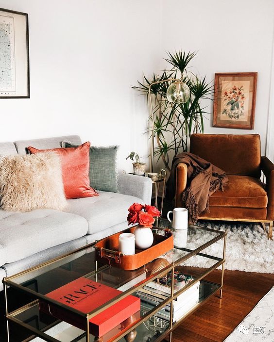 作为无彩色,灰色非常适合作为空间的过渡色,缓解不同色彩带来的差异感,让画面更加和谐,视觉效果也舒适许多;同样,棕色是一种常用在家中的中性色,作为调剂出现也是不错的选择