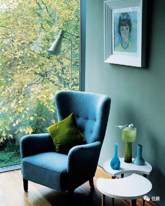 当同为冷色的蓝色与绿色相遇,口味就一点也不清淡了,高饱和色彩给人厚重的质感,建议用白色、浅灰色、木色进行调和,这种组合放在采光好的空间里比较适合