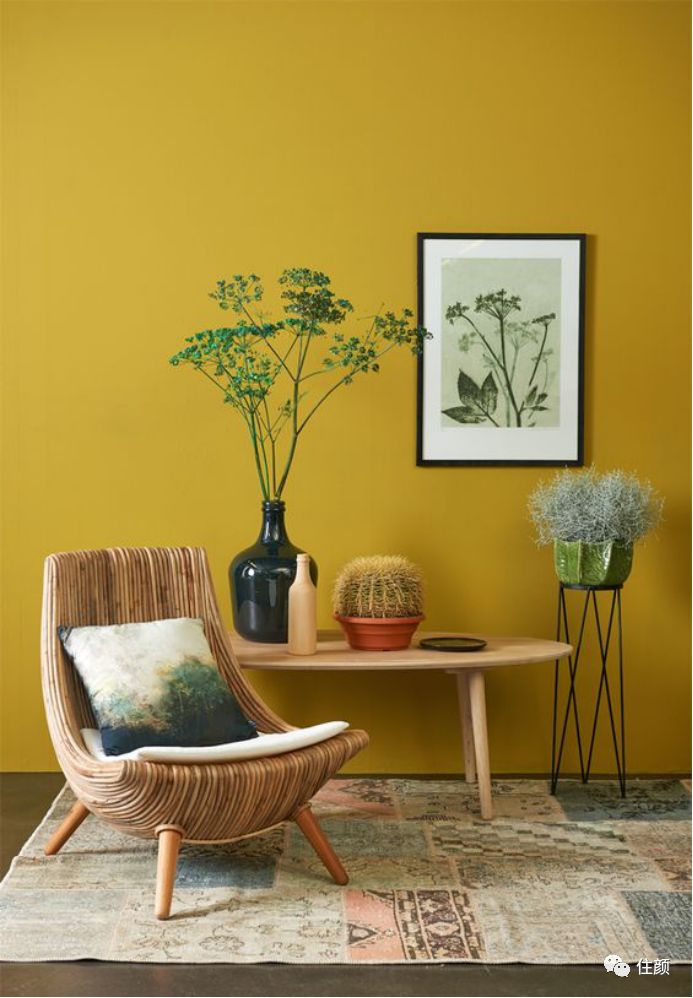 很多人提起黄色,觉得明晃晃的不适合做背景色,但其实避开高明度的柠檬黄,高饱和度的姜黄色做墙色却给人惊喜,这样的色彩适合喜欢复古风的朋友