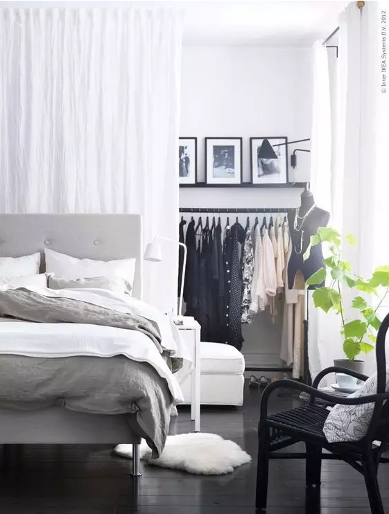 三、窗帘隔断利用滑动式窗帘,在卧室床的后面分割出一个衣帽间,即使是小户型,也可以拥有步入式衣柜。同时,省心省力又省地方,是很多人都喜欢的隔断方式。