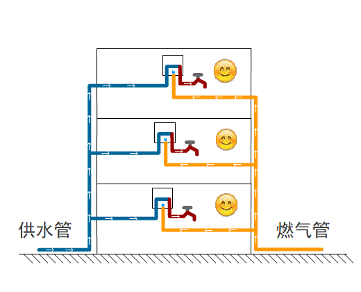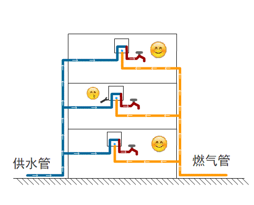非专业人员安装时,很多规范和要求细节都可能会疏忽,甚至会错将热水器燃气管接向水管,下图为正常时的动态图