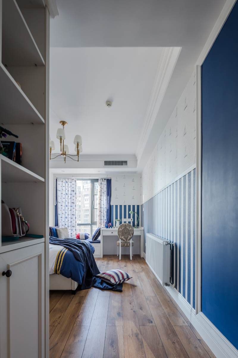 男孩房进门左边一组多功能柜,适合书籍、玩具的收放。男孩房的蓝色,来自海洋的颜色,是不是唤醒了每一个男孩的航海梦呢?