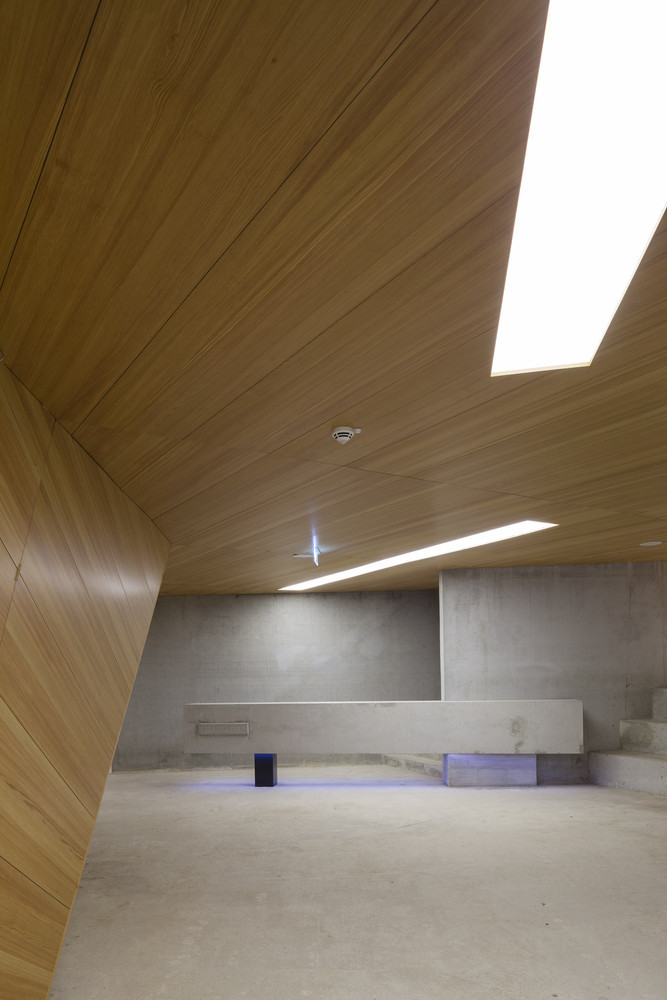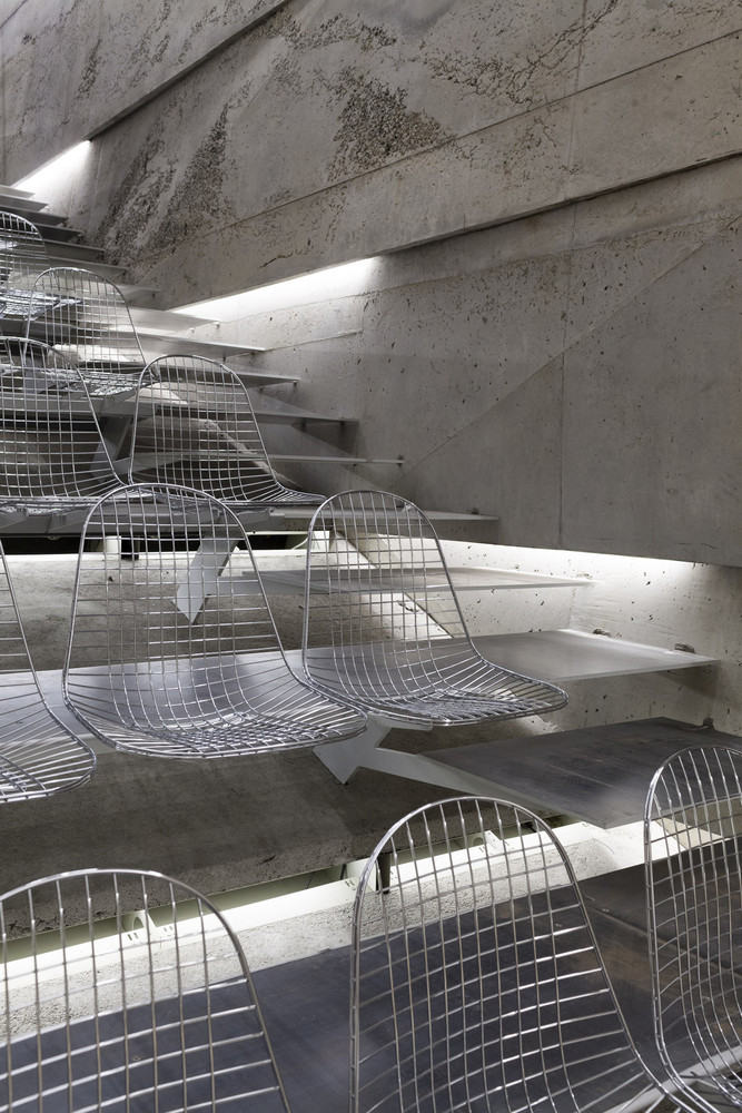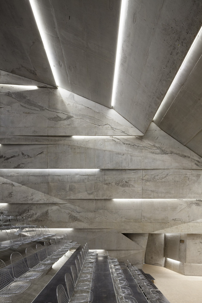 室内不规则的素混凝土墙面以及简洁的座椅看似粗陋,但这都是建筑...
