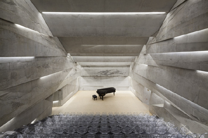 室内不规则的素混凝土墙面以及简洁的座椅看似粗陋,但这都是建筑师审慎考虑的结果,使它的音响效果和照明系统达到一流水准。