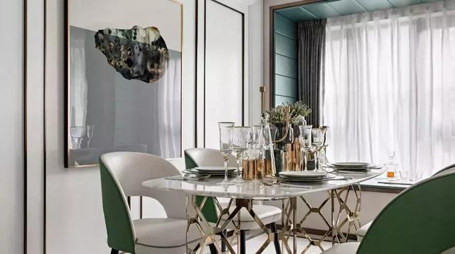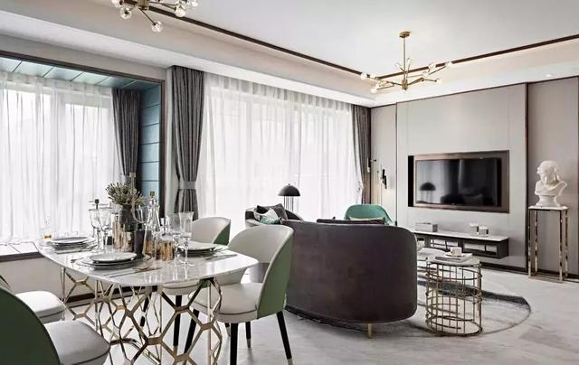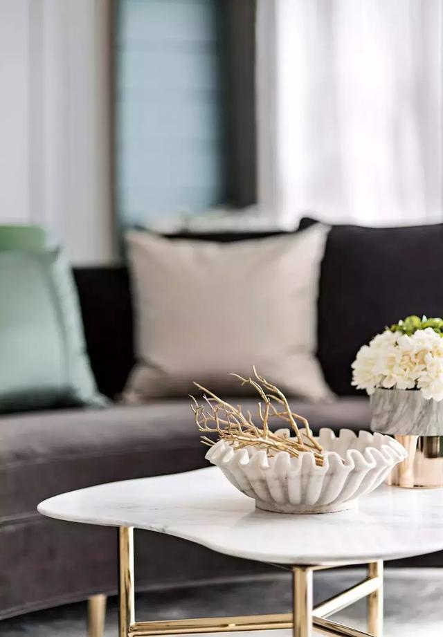 灰色的弧形沙发,铜艺底座 大理石台面的茶几和边几,再加上一把青绿色的休闲椅,呈现出优雅大方的氛围感。