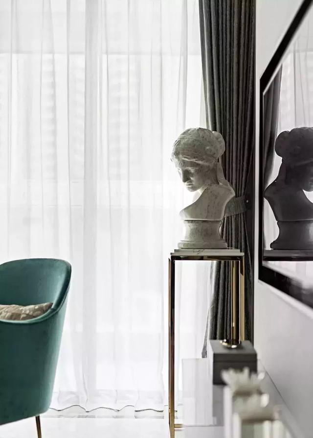 不同的色调划分空间,纯灰色电视背景墙、沙发、窗帘,没有过多修饰。灰色是内敛朦胧、包容百搭,适合辛苦工作一天后回到家彻底放空心灵,慵懒休憩。 石膏雕塑的端景,给客厅也融入了细腻质感的端庄神秘。休闲椅摆上一个靠枕,布置出一个令人舒心放松的悠闲角落。