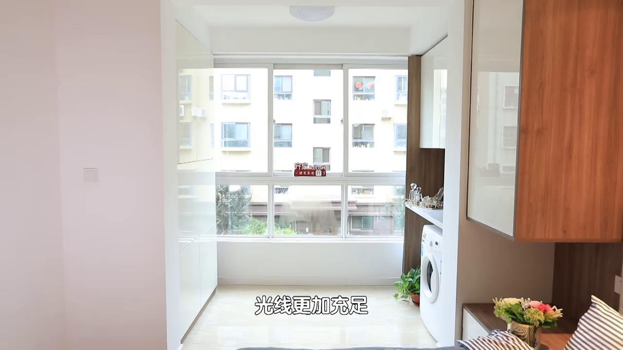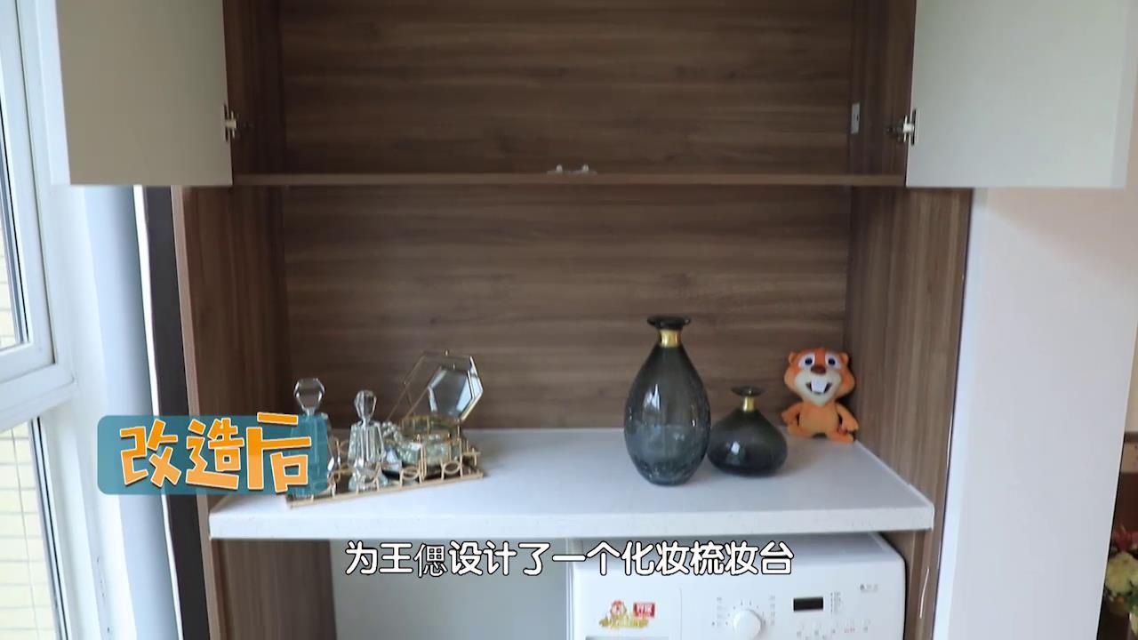 看完儿童房,接下来到了王偲夫妻俩的卧室,这里的改造让夫妻俩惊喜不已。改造前,整个主卧被一张双人床和四个儿童床塞得满满当当,毫无空隙,卧室到阳台的道路也十分狭窄,利用率极低。改造后,设计师将原有的阳台和主卧连通,将阳台制作成了一个集洗衣、储物、化妆的多功能区域。改造前,王偲的化妆品只能放置在电脑桌的一旁,狭窄的桌面既放不开化妆品,光线也不足。改造后,设计师在阳台为王偲设计了一个化妆梳妆台,不但面积增大了,而且在阳台化妆光线更加充足,让女主人的化妆问题彻底解决了。设计师不但为王偲找到了一个化妆区域,而且在储物方面也是丝毫不吝惜。不但将阳台设置成了多个不同形状储物柜,而且在床头也为夫妻俩打造了一个悬挂衣物区。在悬挂衣物柜下还打造了一个同样大小的床头柜,这样不仅可以随手放置手边物,而且仅仅占用50厘米,就将原来的衣物储存问题解决了,真可谓一举两得。 暖暖的新家